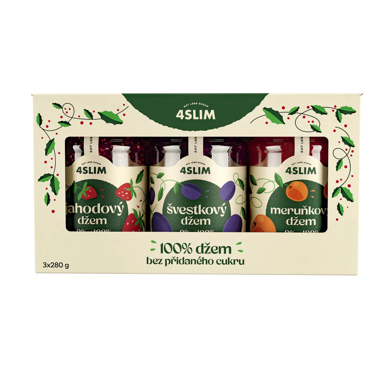 Obdarujete své blízké tím, co má skutečnou chuť - čistým ovocem bez přidaného cukru. Limitovaná edice multipacku 4SLIM ve vánočním designu přináší tři oblíbené příchutě 100% ovocných džemů bez přidaného cukru. Díky šetrnému zpracování si džemy zachovávají intenzivní ovocnou chuť a ideální strukturu bez přidání cukru, umělých sladidel nebo zahušťovadel.