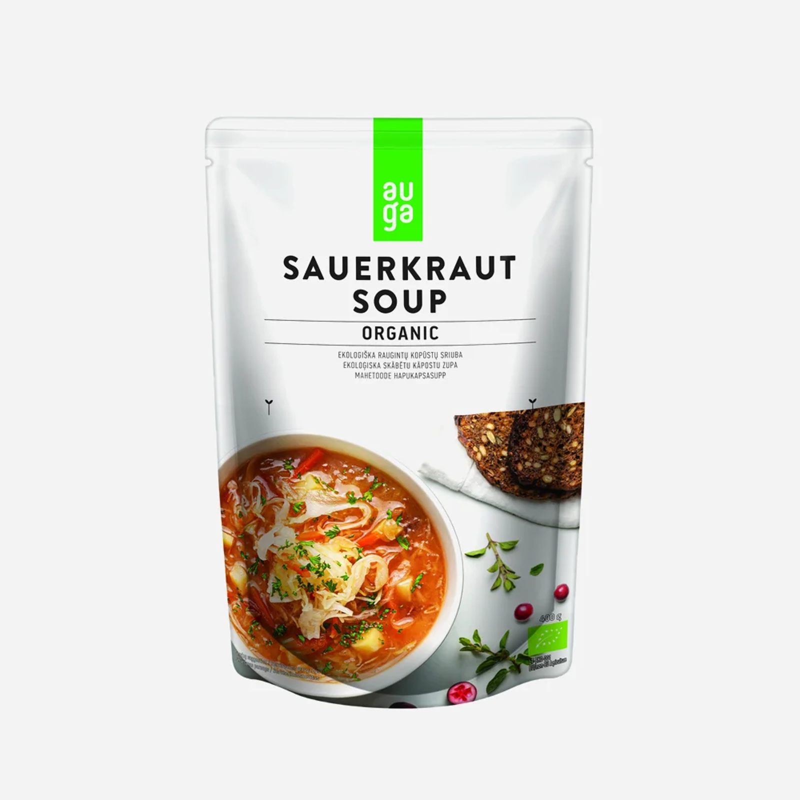 Jedná sa o tradičné polievku zo strednej a východnej Európy, ktorá sa vyrába z kyslej kapusty okoreneného rascou, brusnicami a má špecifickú kyslú chuť. V Auga vyrába biopotraviny chytro. Pestujú sa prirodzene, bez vyčerpávanie pôdy, pomocou inovatívnych technológií a prísne sa vyhýbajú akýmkoľvek chemikáliám v procese. Lahodná polievka je balená v ľahkom sáčku, ktorý v porovnaní s plechovkou rovnakej veľkosti vytvára výrazne menej emisií CO2. Stačí zahriať a užívať si skvelú chuť!