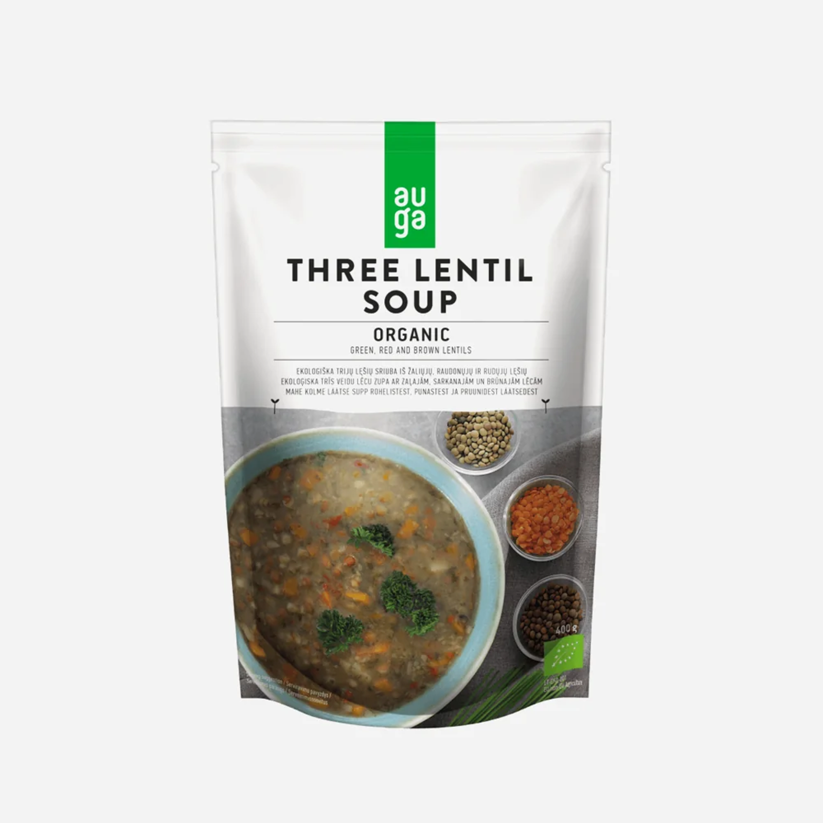 Už hotová krémová polievka, pasterizovaná, z červenej, zelenej a hnedej šošovice.