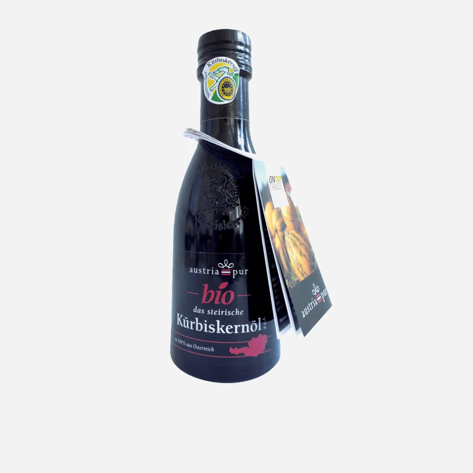 Jedinečný vzhľad a chuť tekvicového oleja, označovaného ako ,,zelené štajerské zlato", si stále častejšie dobýva medzinárodnú kuchyňu a srdce hociktorého labužníka. Dokonalá kvalita, pravosť a pôvod tohto oleja sú garantované prísnym kontrolným systémom. V chuti sýto zeleného tekvicového oleja vynikajú predovšetkým harmon orechové tóny. 100% originálny štajerský olej spoznáte na prvý pohľad podľa pečate ,, Chránené zemepisné označenie". Čo robí štajerský olej tak cenným? Tento olej dodáva telu dôležité živiny ako kyselinu linolovú a vitamín E. Naše telo nie je schopné si tieto látky vytvoriť, preto musia byť dodané v strave. Organizmus ich potrebuje na stavbu a zachovanie buniek. Tento olej získal tiež označenie programu VÍM, ČO ÍM, ktoré označuje kvalitné a nutrične vyvážené potraviny.