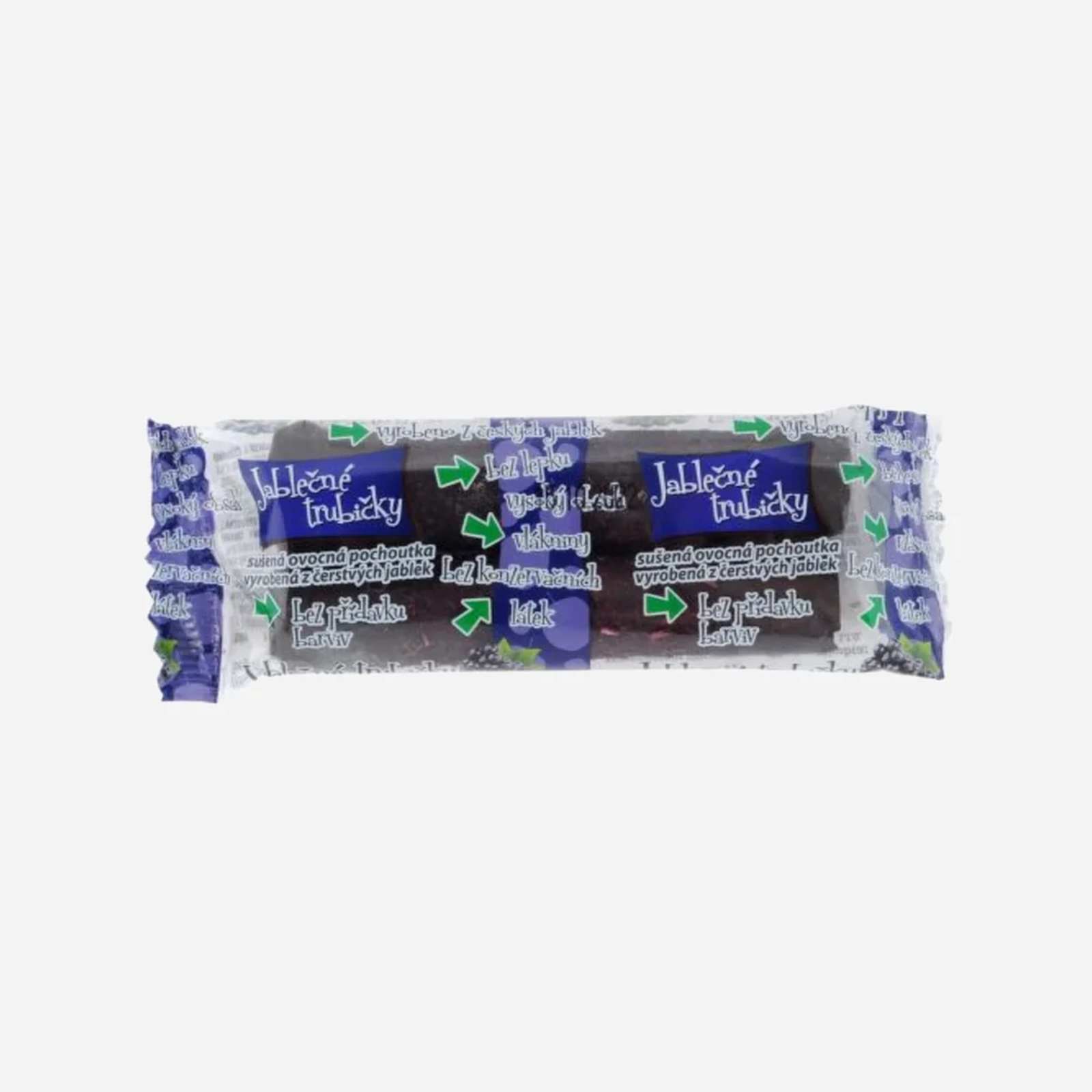 Sušená ovocná pochúťka vyrobená z čerstvých jabĺk a ríbezľového koncentrátu, čiastočne polievaná čokoládovou polevou.