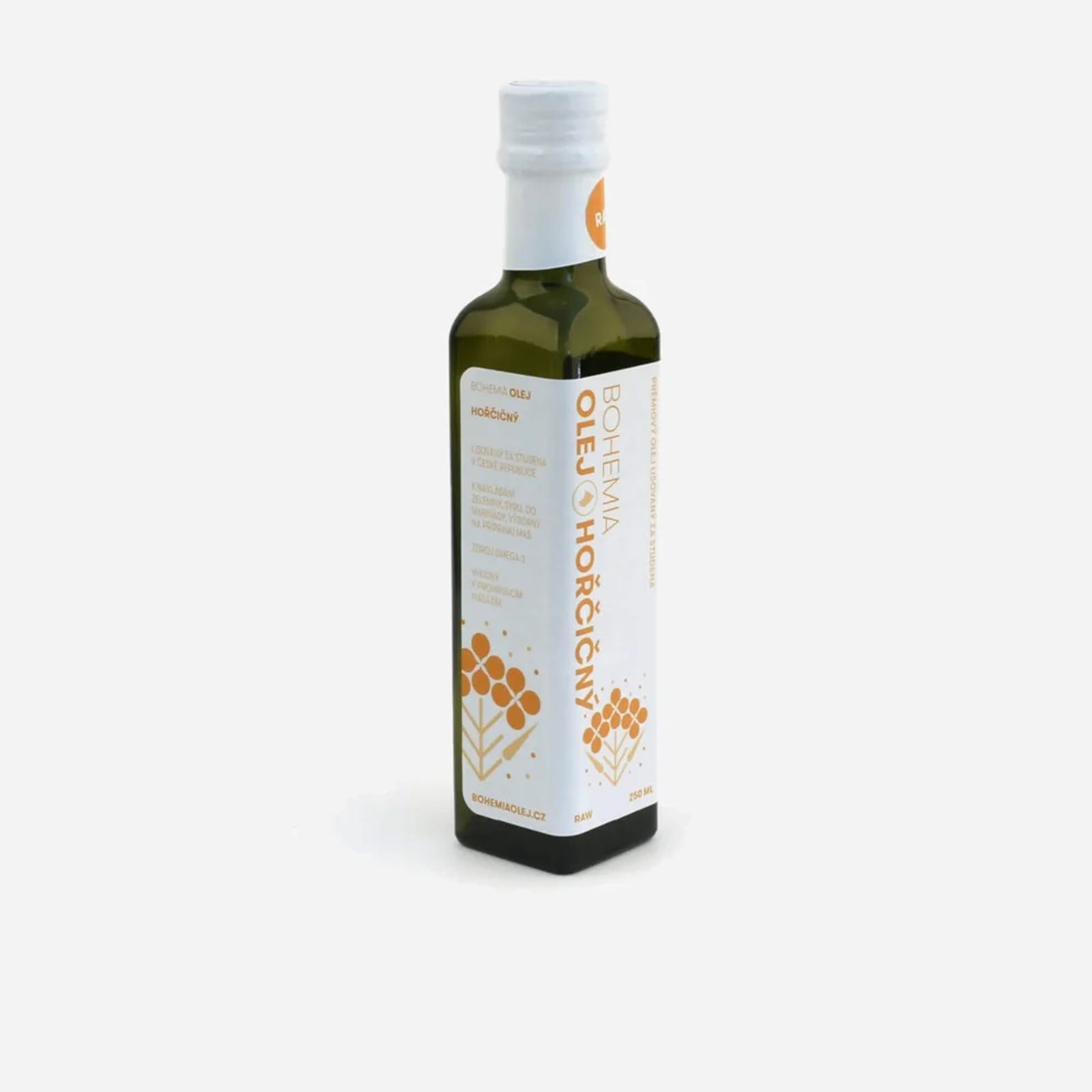 Bohemia oleje sú lisované v Západných Čechách tradičnou šetrnou metódou za veľmi nízkych teplôt. Nesú viac než kvalitu olejov lisovaných za studena, sú to oleje RAW. Výlisnosť je tak síce nižšia, ale olej si tak uchováva chuť, vôňu i hodnotný komplex biologicky aktívnych látok horčičných semienok. Bohemia horčicový olej má sýto žltú farbu a pikantnú chuť, ktorá prehreje na tele i na duchu. Svojou pikantnosťou zaujímavo okorení šalátové zálievky, domáce majonézy, dipy. Je vhodný aj do teplej kuchyne. Marinované mäso v horčičnom oleji krásne skrehne a zachová šťavu. Vďaka svojmu zloženiu pôsobí ako prírodný konzervant, je preto výborný na nakladanie húb či zeleniny.
