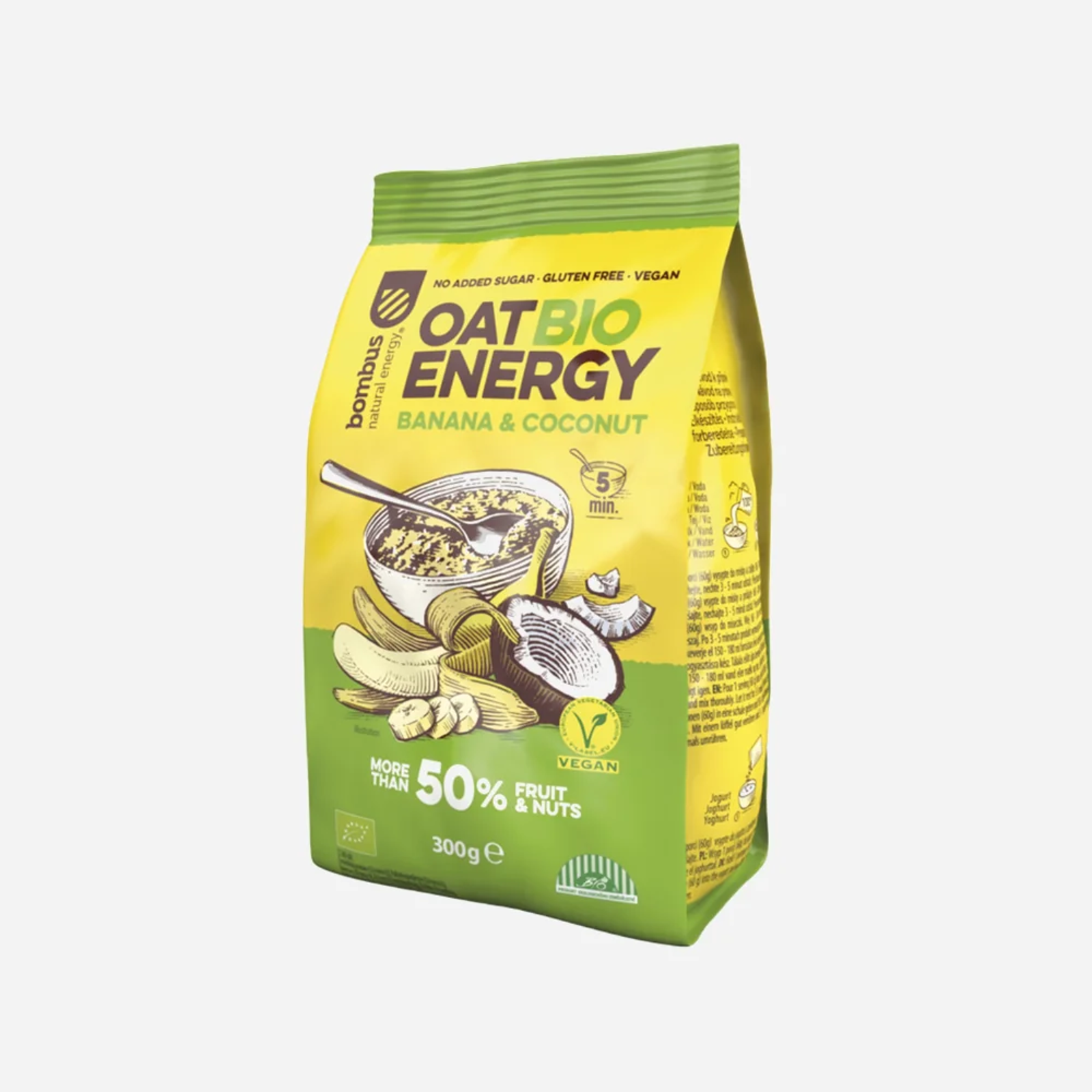 Bezlepková bio ovsená kaša z radu Oat Bio Energy od českej značky Bombus. Táto kaša obsahuje viac ako 50% ovocia a orechov a kombinuje osvedčené príchute banán a kokos.