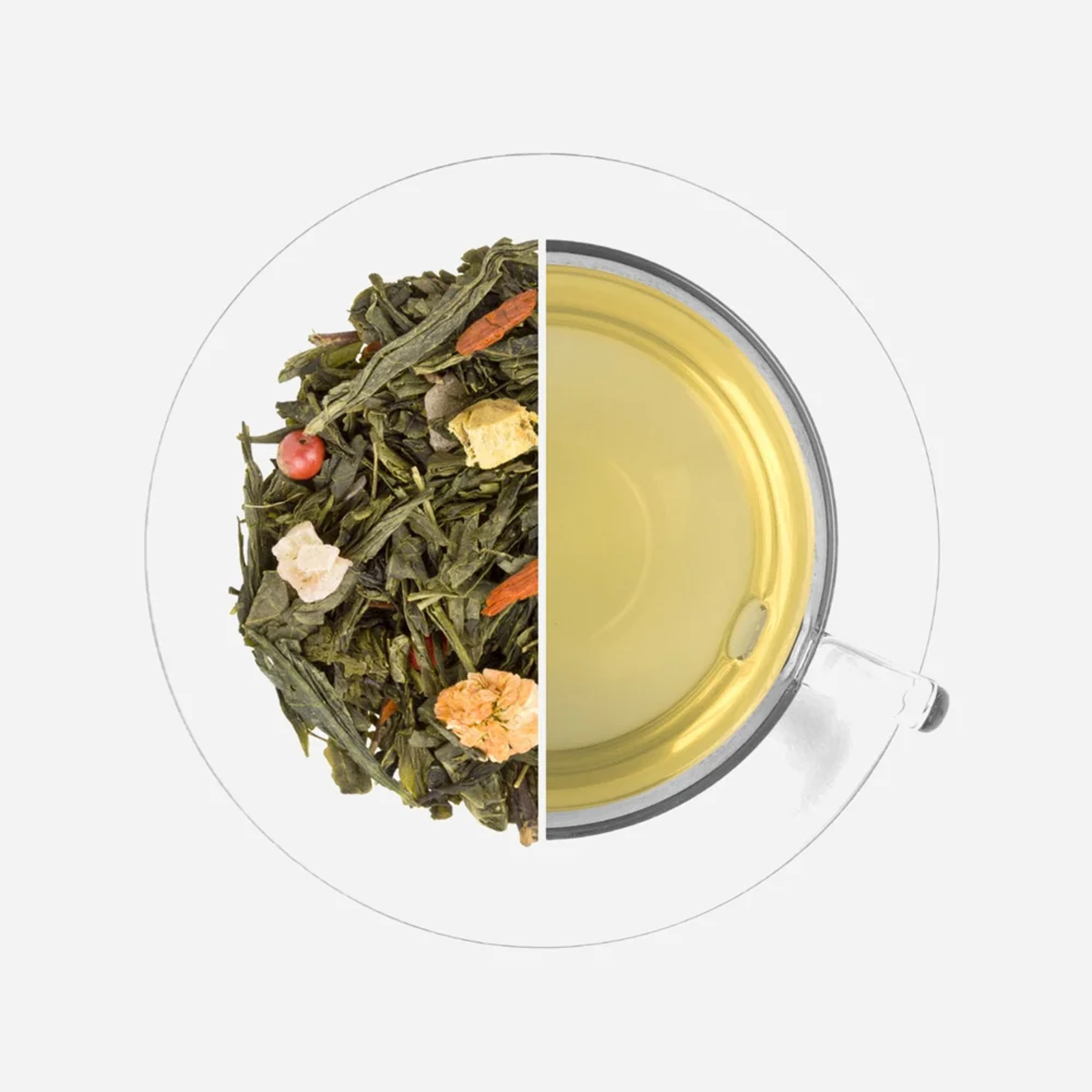 Pravý zelený čaj Sencha s chuťou tropického ovocia s tónmi korenia. Krajina pôvodu: Čína.