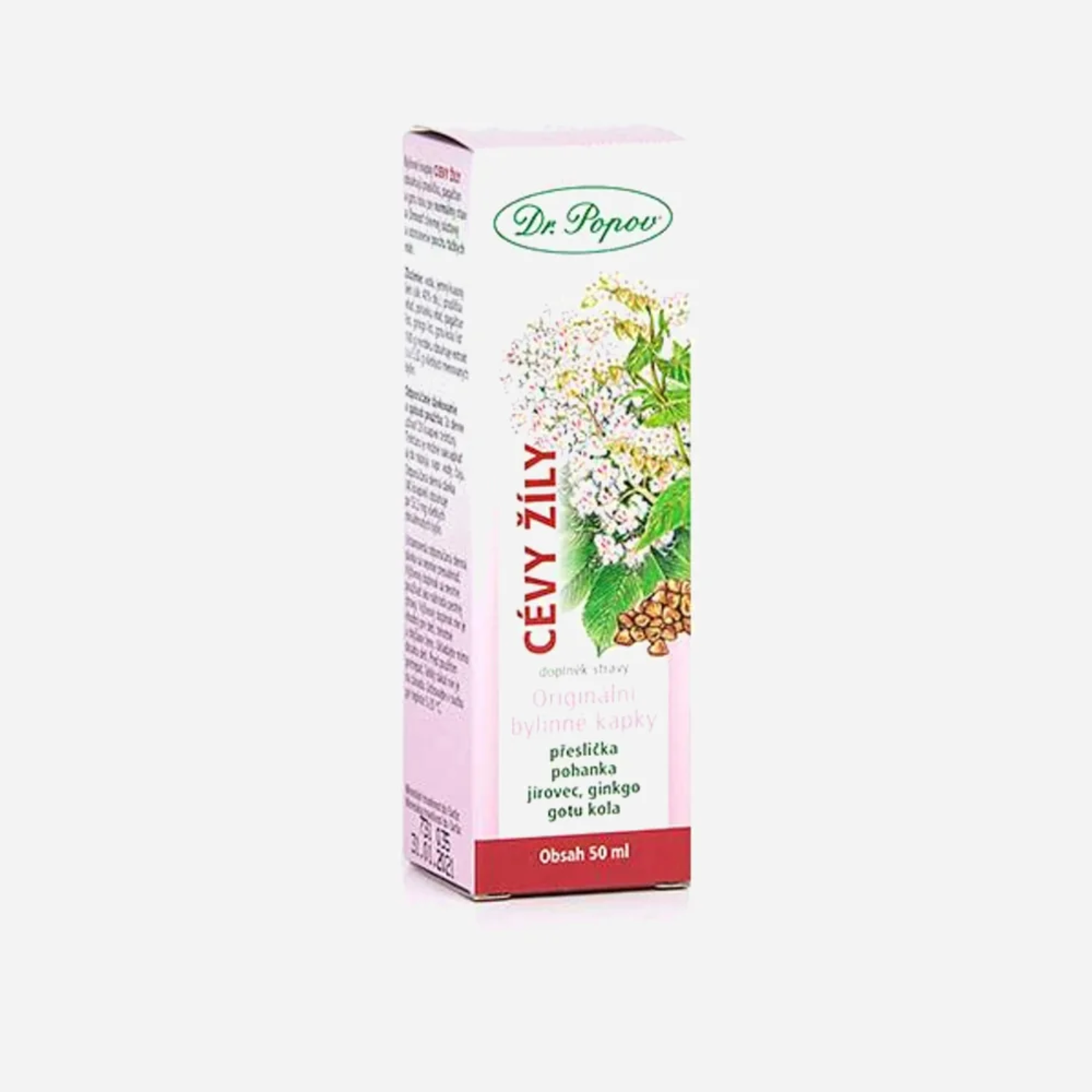 Bylinné kvapky Dr. Popova Cievy a žily obsahujú kombináciu 5 tradične používaných bylín. Jednou z hlavných je pagaštan, obľúbená bylina, na ktorú by nedali dopustiť ani naše babičky. Pagaštan, a rovnako tak gotu kola (pupočník ázijský), podporuje správnu funkciu cievnej sústavy a zmierňuje tak nepríjemný pocit ťažkých nôh. Praslička udržuje správnu činnosť kardiovaskulárneho systému, zvyšuje odolnosť, osviežuje telo a podporuje vylučovanie. Ginkgo biloba podporuje zdravú mikrocirkuláciu krvného systému, podieľa sa teda na normálnej činnosti drobných krvných a lymfatických ciev a správnom prekrvenie končatín. Kvapky obsahujú ešte pohánku, ktorá má antioxidačné účinky a podporuje činnosť kardiovaskulárneho systému a zdravú funkciu obehovej sústavy.