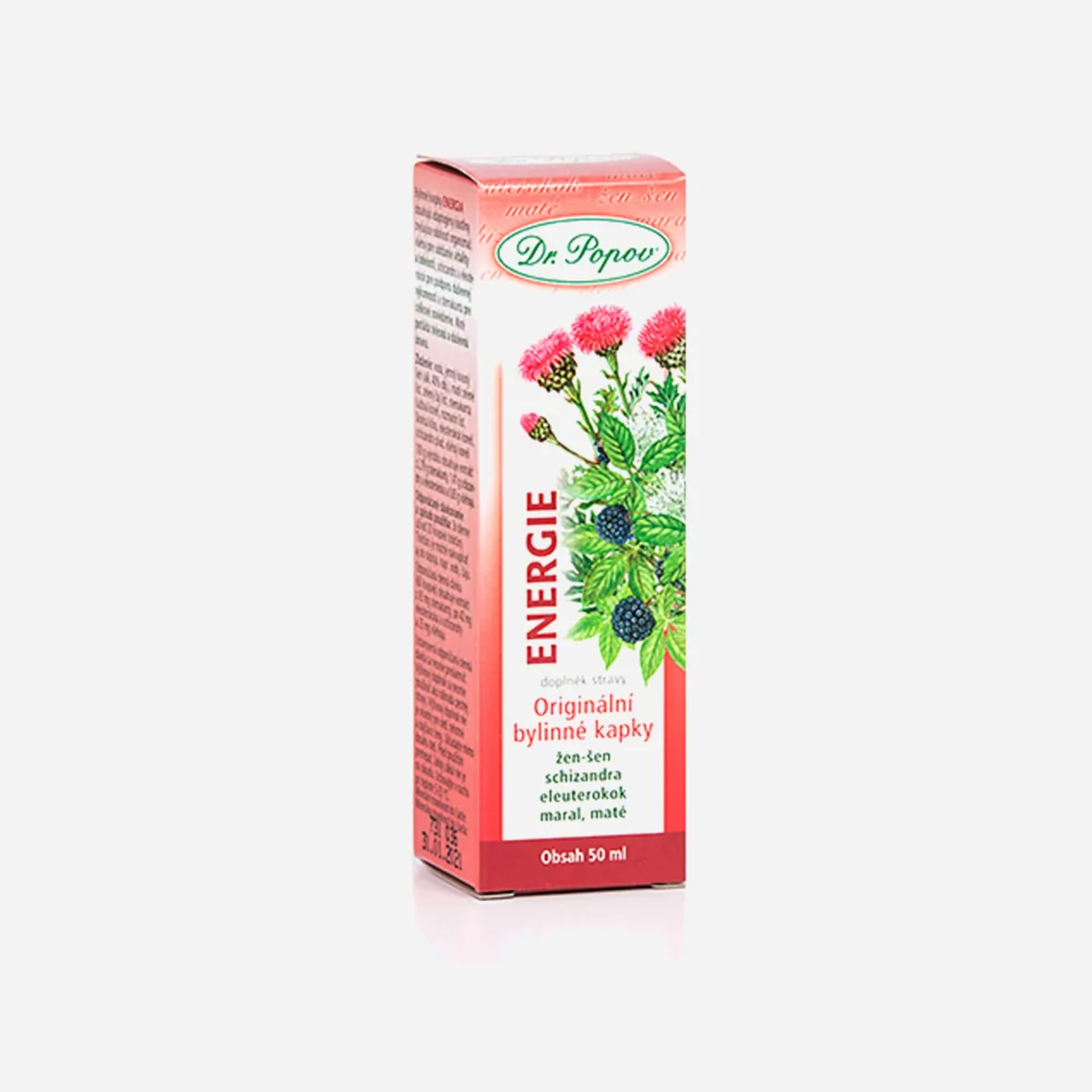 Originálne bylinné kvapky Dr. Popova Energia obsahujú adaptogény (rastliny zvyšujúce odolnosť organizmu): ženšen pre udržanie vitality a bdelosti, schizandru a eleuterokok pre podporu duševnej výkonnosti a maral pre celkové osvieženie. Maté potláča telesnú a duševnú únavu.
