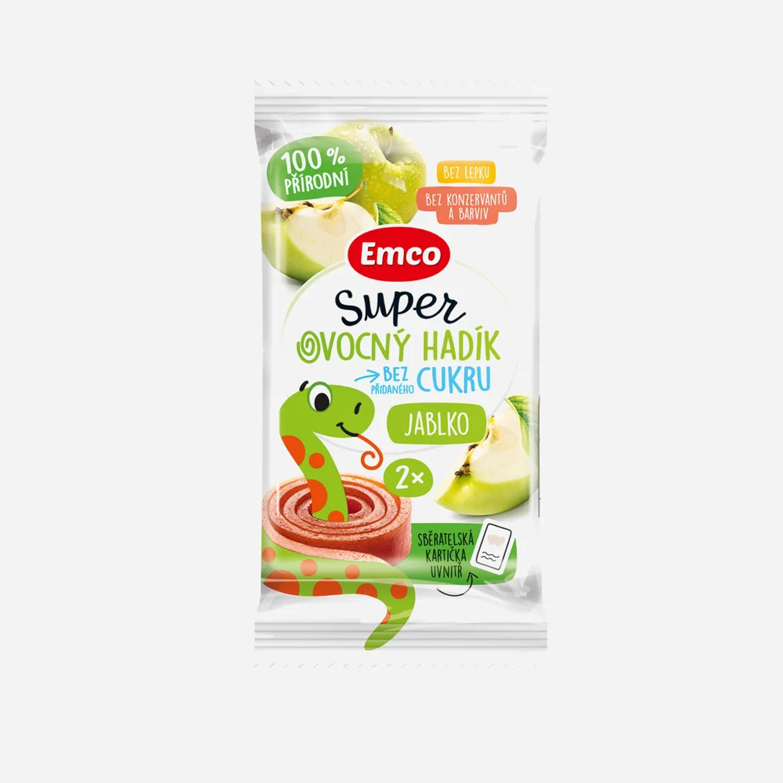 Super ovocná desiata nielen pre deti. Ideálne do školy pre každého maškrtila. Vnútri balenia sa chúli 2 ovocné pásiky stočené do roliek - hadíkov. Hadice neobsahujú žiadny pridaný cukor a sladkí sú len vďaka ovociu. Hravo a zdravo nahradí cukríky či iné sladkosti. Súčasťou balenia je zberateľská kartička. K dostaniu sú v 3 obľúbených príchutiach - jahoda, jablko a mango.