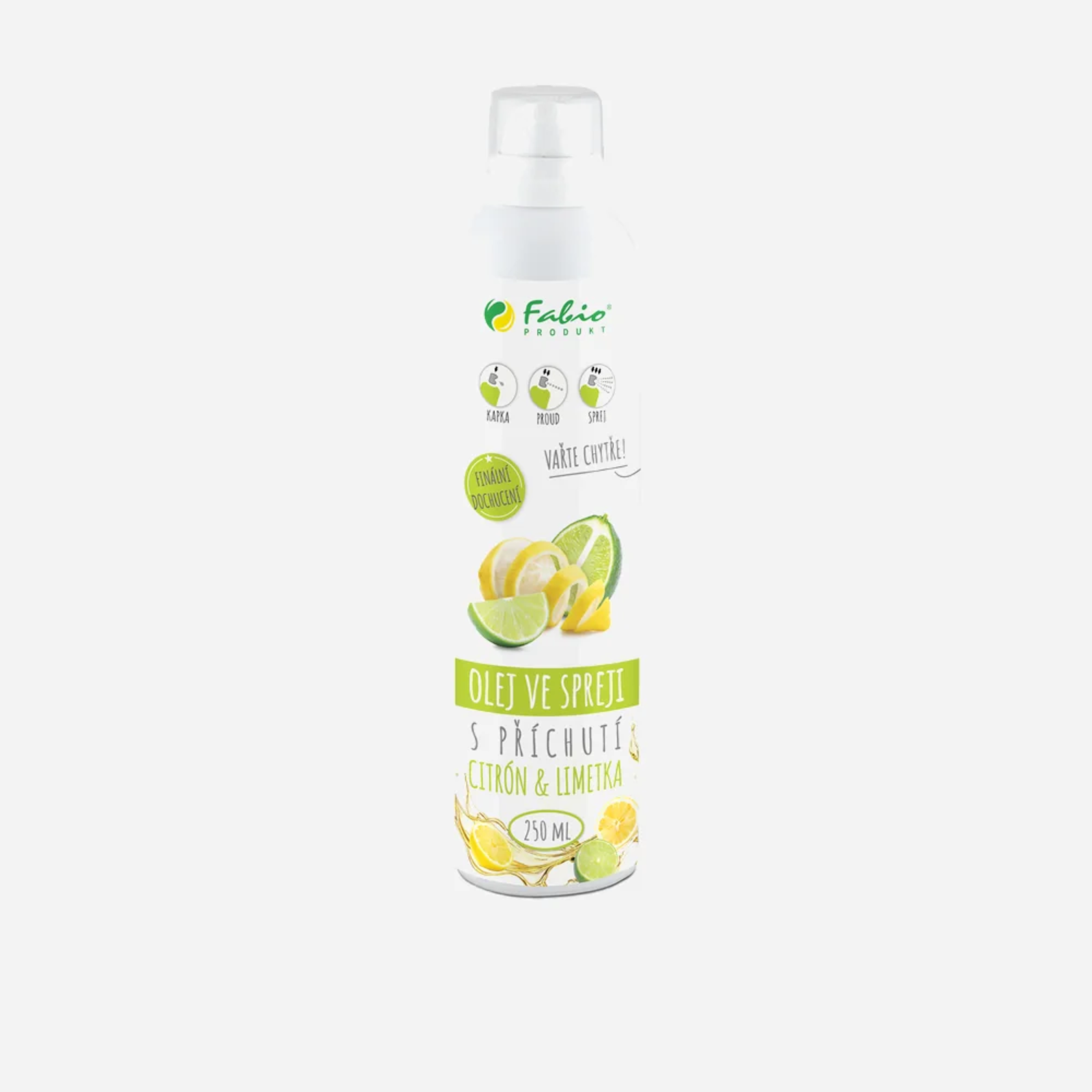 Olej v spreji FABIO citrón-limetka je repkový olej s vyladenou citrusovou príchuťou na rýchle tepelné spracovanie a finálne dochutenie. Repkový olej je vhodný na každodenné použitie predovšetkým vďaka priaznivému zloženiu mastných kyselín, konkrétne vysokému obsahu omega-3 nenasýtených mastných kyselín.