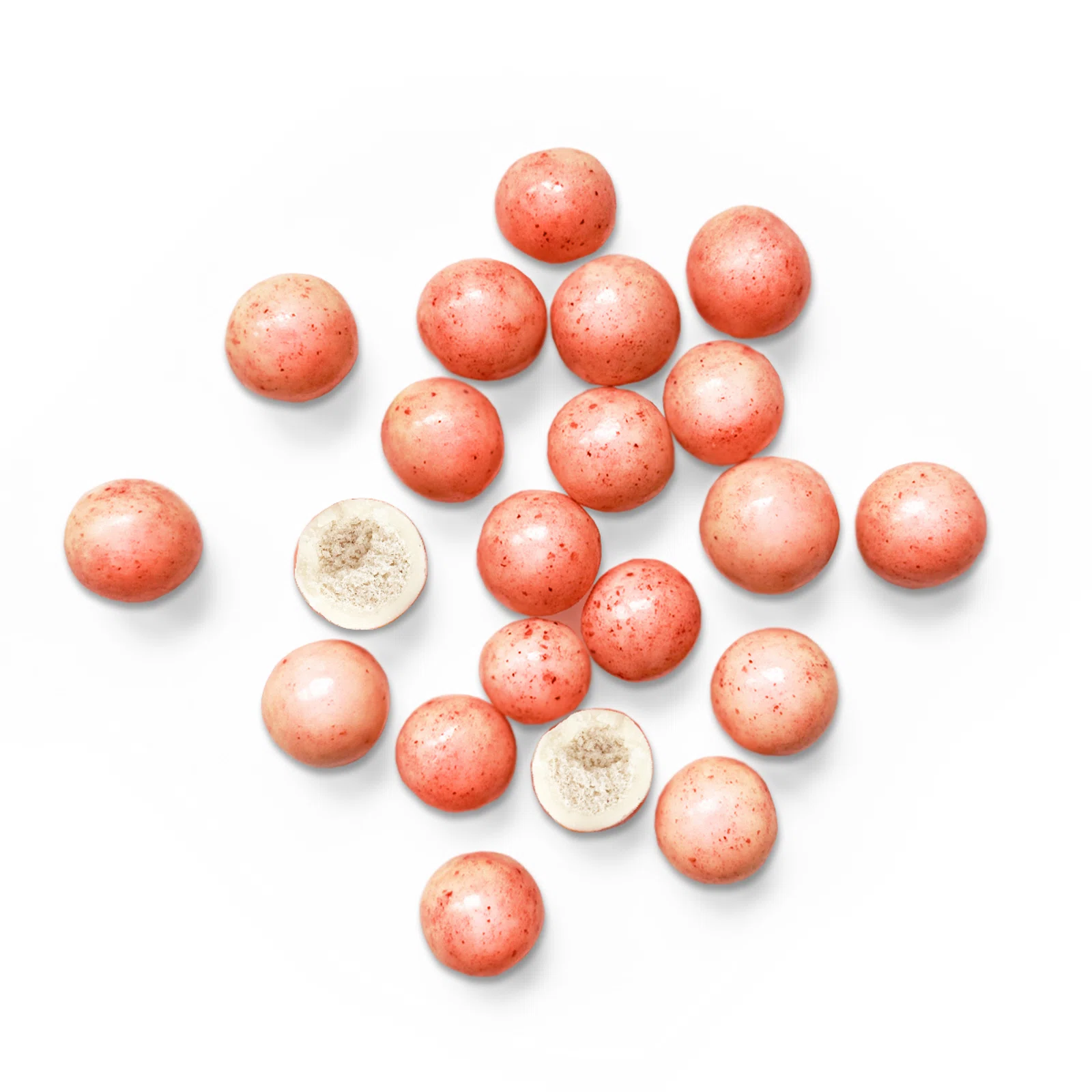 Zloženie: | biela čokoláda 75 % (cukor, kakaové maslo, sušené plnotučné mlieko, sušená srvátka (mlieko), prírodná vanilková aróma, emulgátor: sójové lecitíny), sladové guličky 20 % (ryžová múka, pšeničný slad, cukor, dextróza), glukózový sirup, jogurtový prášok 1 % (mlieko), jogurtová aróma 1 %, prášok z lyofilizovaných malín 1 %, dextrín, leštiace látky: arabská guma, šelak; kokosový olej, repkový olej. |