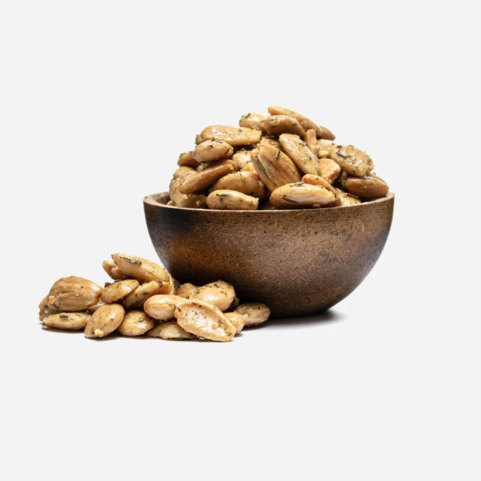 Zloženie: Mandle 94%, trstinový cukor 2,6%, bylinky (oregano, bazalka, cesnak, paprika, cibuľa) 1,8%, soľ 0,85%, chilli papričky 0,7%, cícerová múka 0,1%