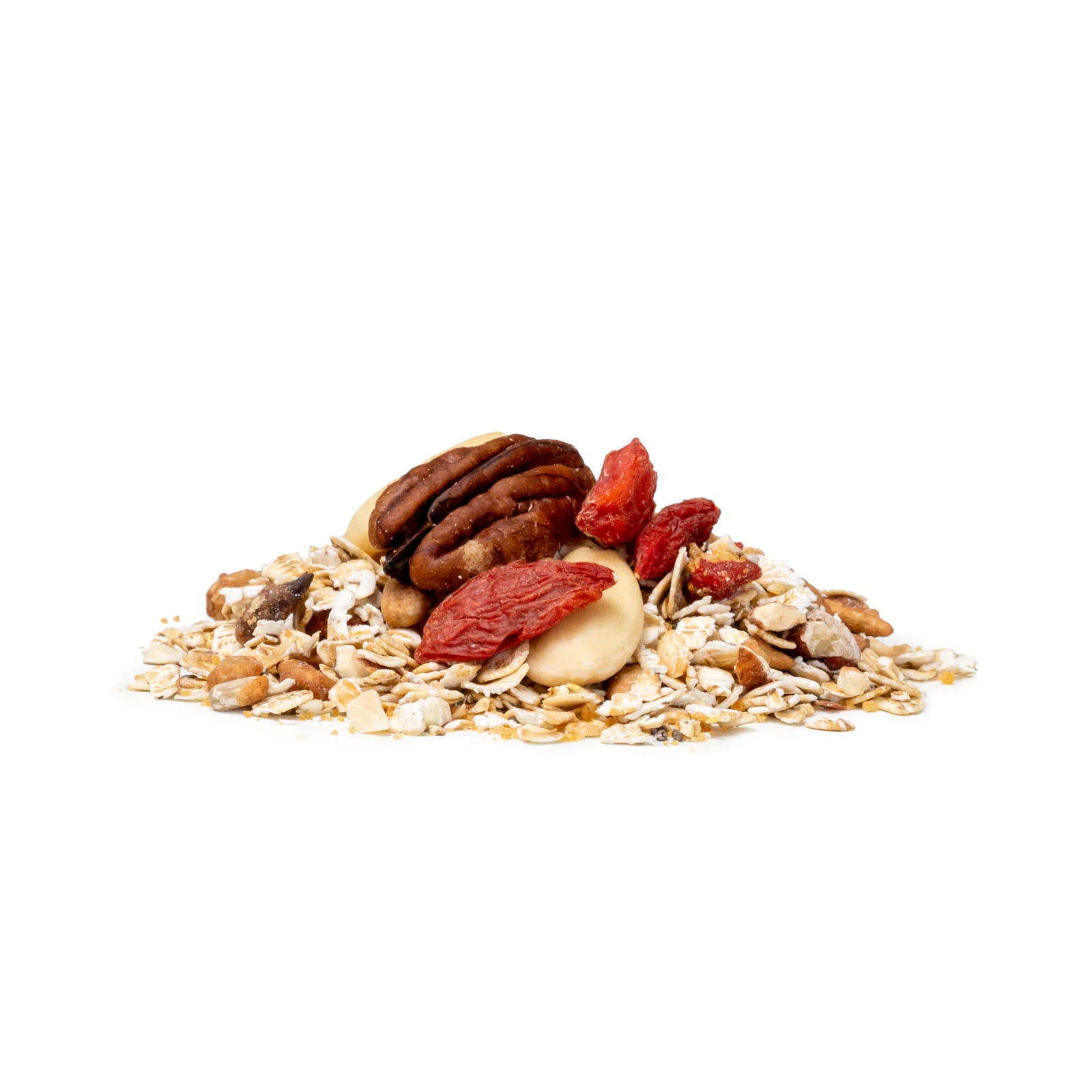 Ako vždy – len z tých najlepších ingrediencií! Famózne kúsky pražených pekanových orechov a mandlí dopĺňajú bezlepkové ovsené vločky s klíčkami, ktoré sú v porovnaní s neklíčeným zrnom oveľa ľahšie stráviteľné. V zložení kaše nájdete aj chia semienka, slnečnicové semienka v cukre a škorici, kustovnicu čínsku a sušenú trstinovú šťavu.
