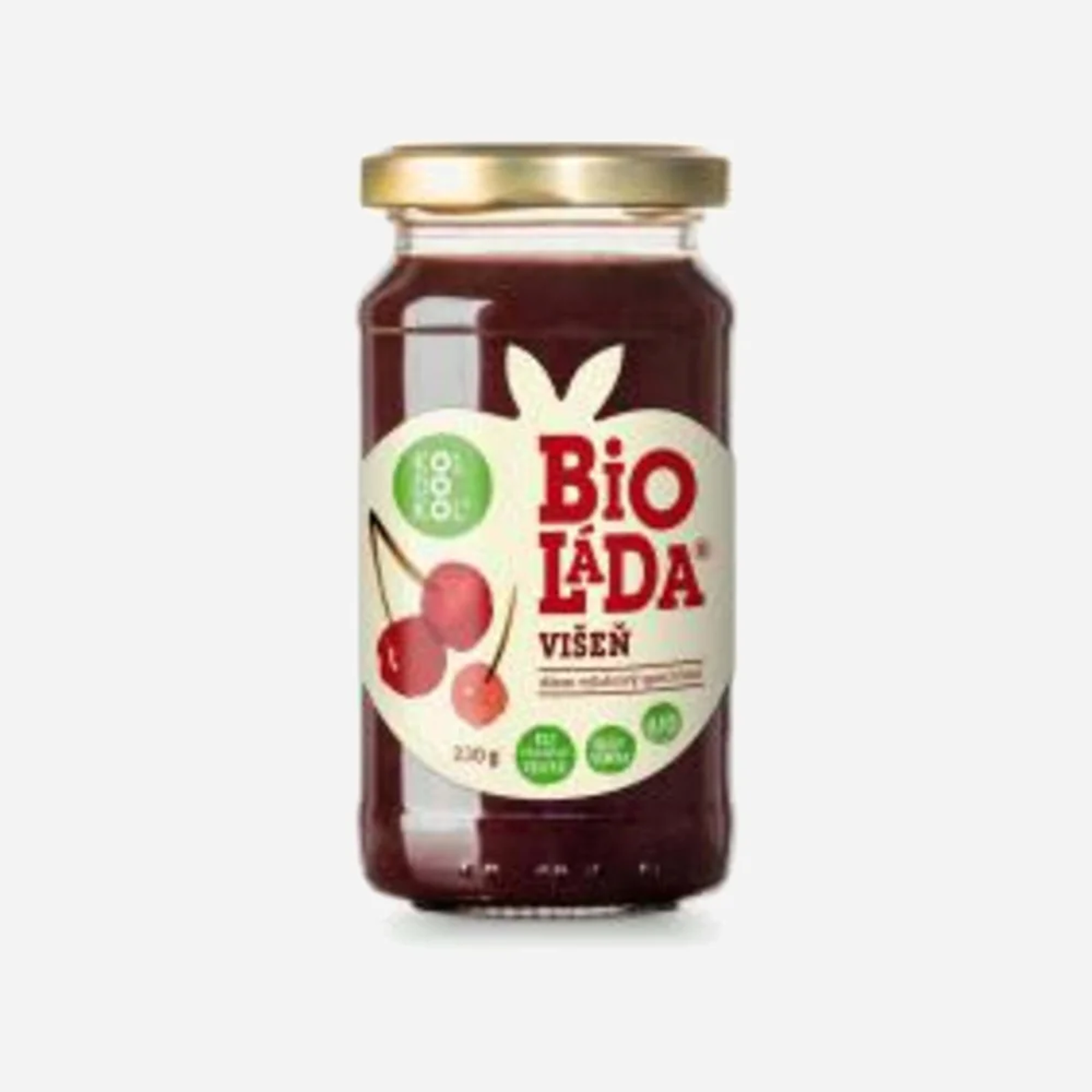 Bio džem s lahodnou chuťou višní a príjemnou konzistenciou s kúskami ovocia sladené koncentrovanou šťavou z 1,2 kg jabĺk.