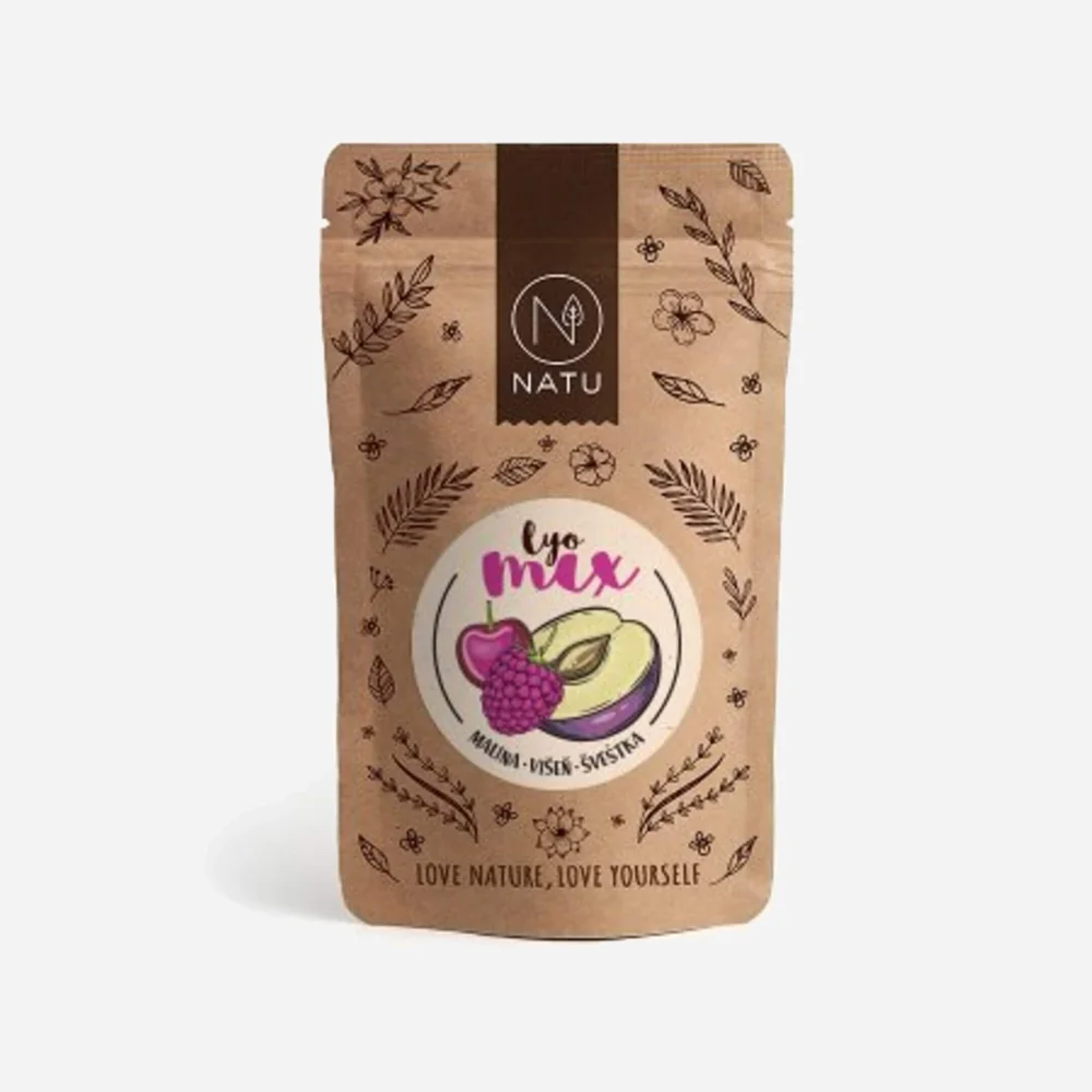 Zloženie: 43% lyofilizované maliny, 29% lyofilizované višne, lyofilizované slivky
