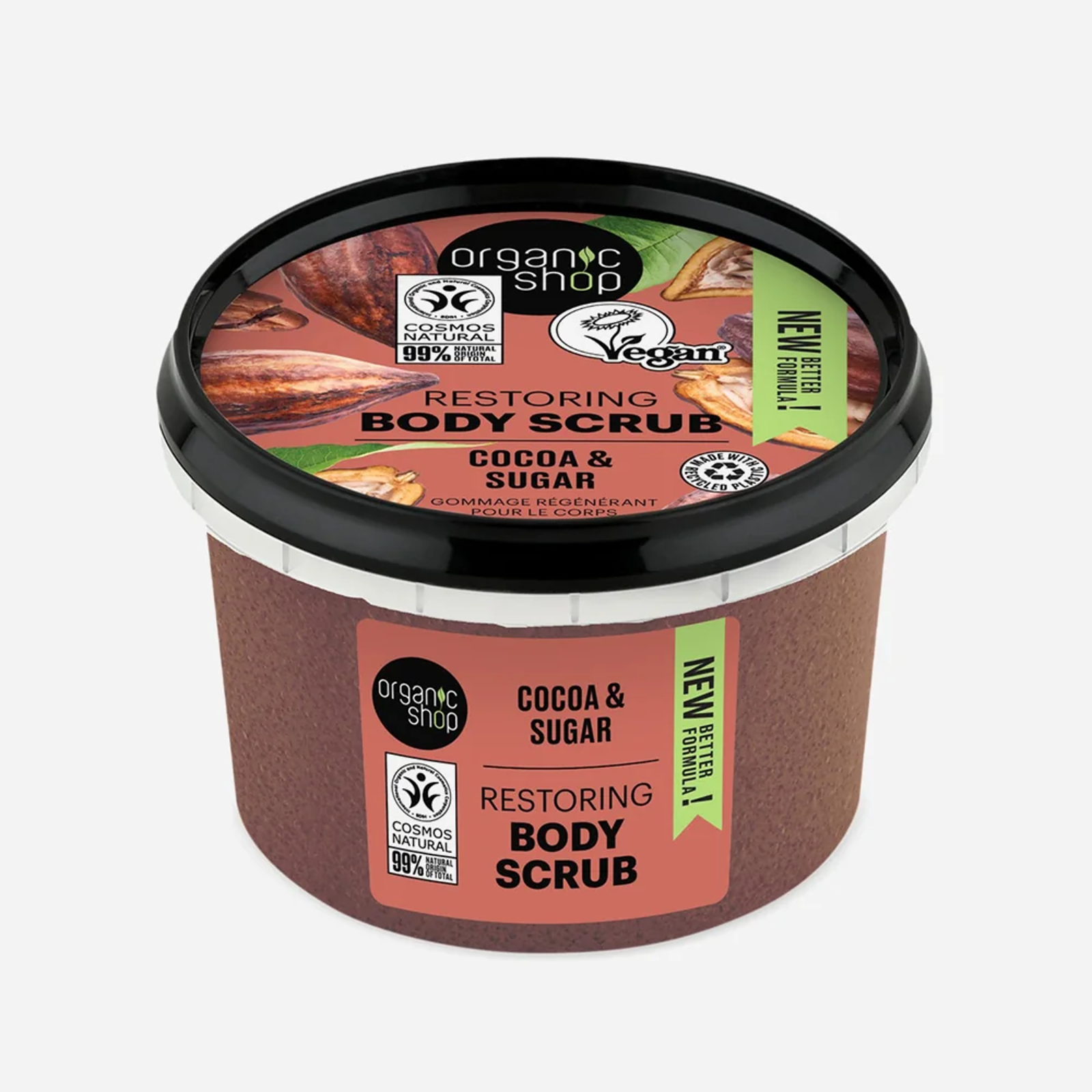 Prírodný obnovujúci telový peeling s organickým kakaovým maslom a prírodným cukrom na starostlivosť o pokožku.