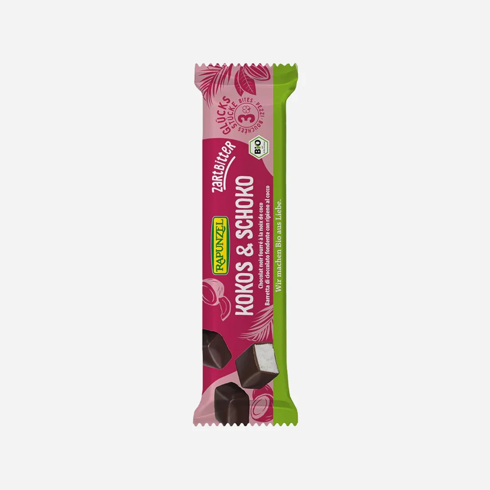Každé balenie tejto kokosovej sladkosti obsahuje 3 bochníčky zmesi strúhaného kokosu so sirupom z ryže a agáve, obalené vrstvičkou horkej čokolády. Zmes nie je sladená trstinovým či repným cukrom, iba týmito sirupmi. Horká čokoláda obsahuje trstinový cukor. Výrobok môže obsahovať stopy lepku, takže nie je vhodný pre celiakov, ale pokiaľ sa lepku vyhýbate z diétnych dôvodov, je pre vás táto pochúťka vhodná.