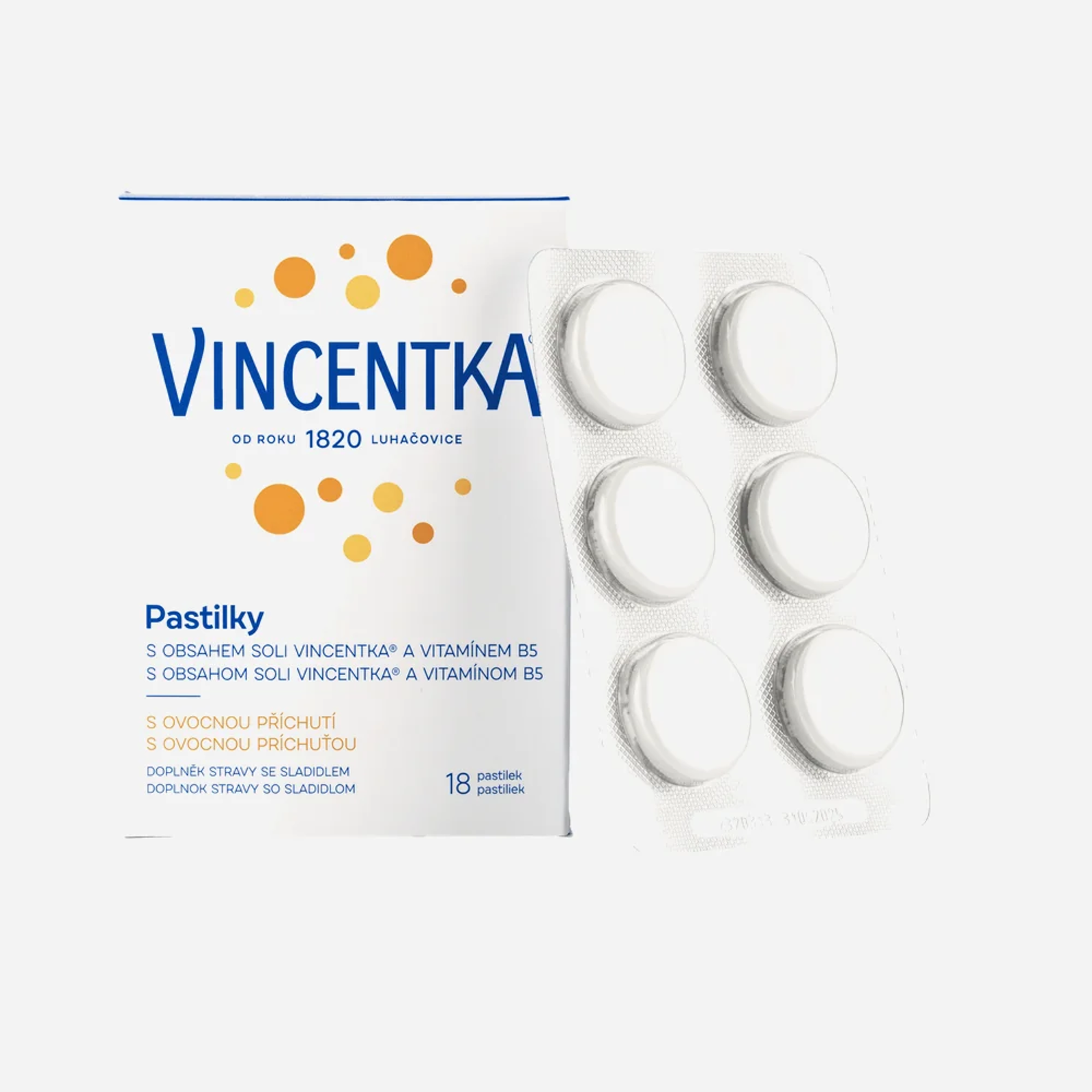 Vincentka pastilky s ovocnou alebo bylinnou príchuťou je doplnkom stravy. Určené pre starostlivosť o sliznicu dutiny ústnej a nosohltanu. Produkt z minerálnej vody Vincentka z prírodného liečivého zdroja.