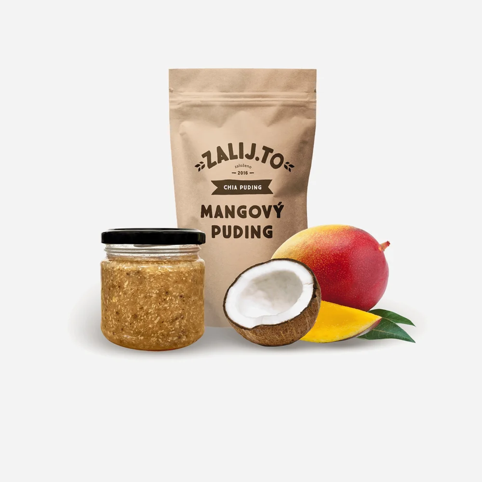 Chia puding mangový v prášku je zložený zo surovín ako sú strúhaný kokos, lyofilizované mango, kešu orechy, mandle, chia semienka 5%, prírodné zahusťovadlo xantán. Podiel chia semienok zaisťuje prísun veľké množstvo minerálov, vlákniny a omega-3 mastných kyselín v podobe tuku, v kombinácii s ovocím a ďalšími zložkami tvorí nielen dokonalú harmóniu chuti, ale aj raňajky alebo desiatu plnú živín, ktorá skvele štartuje každé ráno.