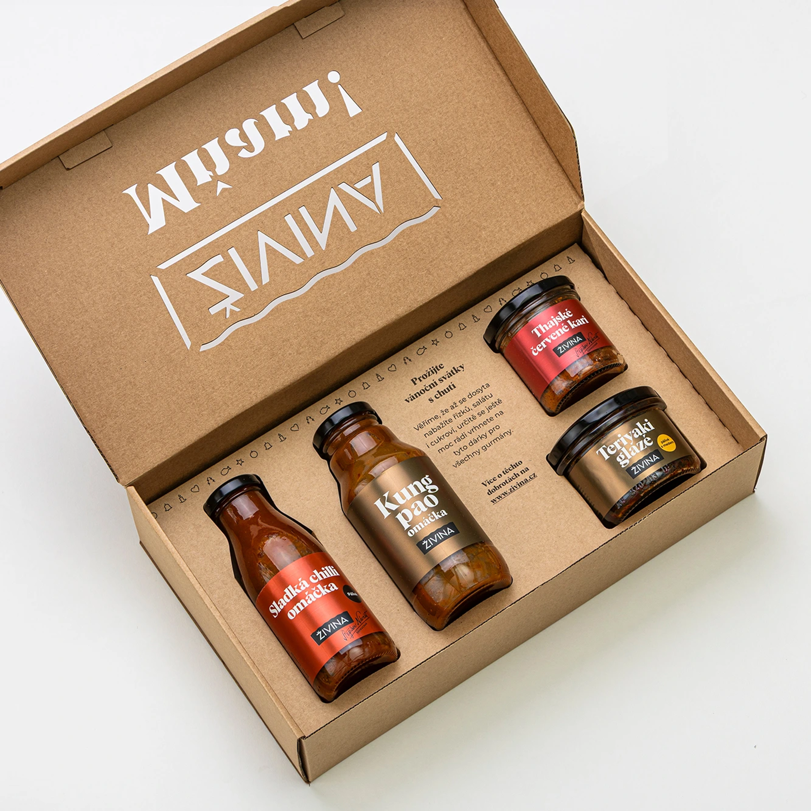 Hľadáte darček, ktorý nezapadne? Darček na chuť je ideálnou kombináciou pre každého, kto rád dobre je, ale nechce tráviť hodiny v kuchyni. Štyri výberové omáčky z ponuky Živiny - Kung Pao, Sladká chilli omáčka pálivá, Thajské červené karí a Teriyaki glazé - patria k tým najpredávanejším. A nie je divu. Každá z nich dodá jedlu bohatú a autentickú chuť v priebehu pár minút.