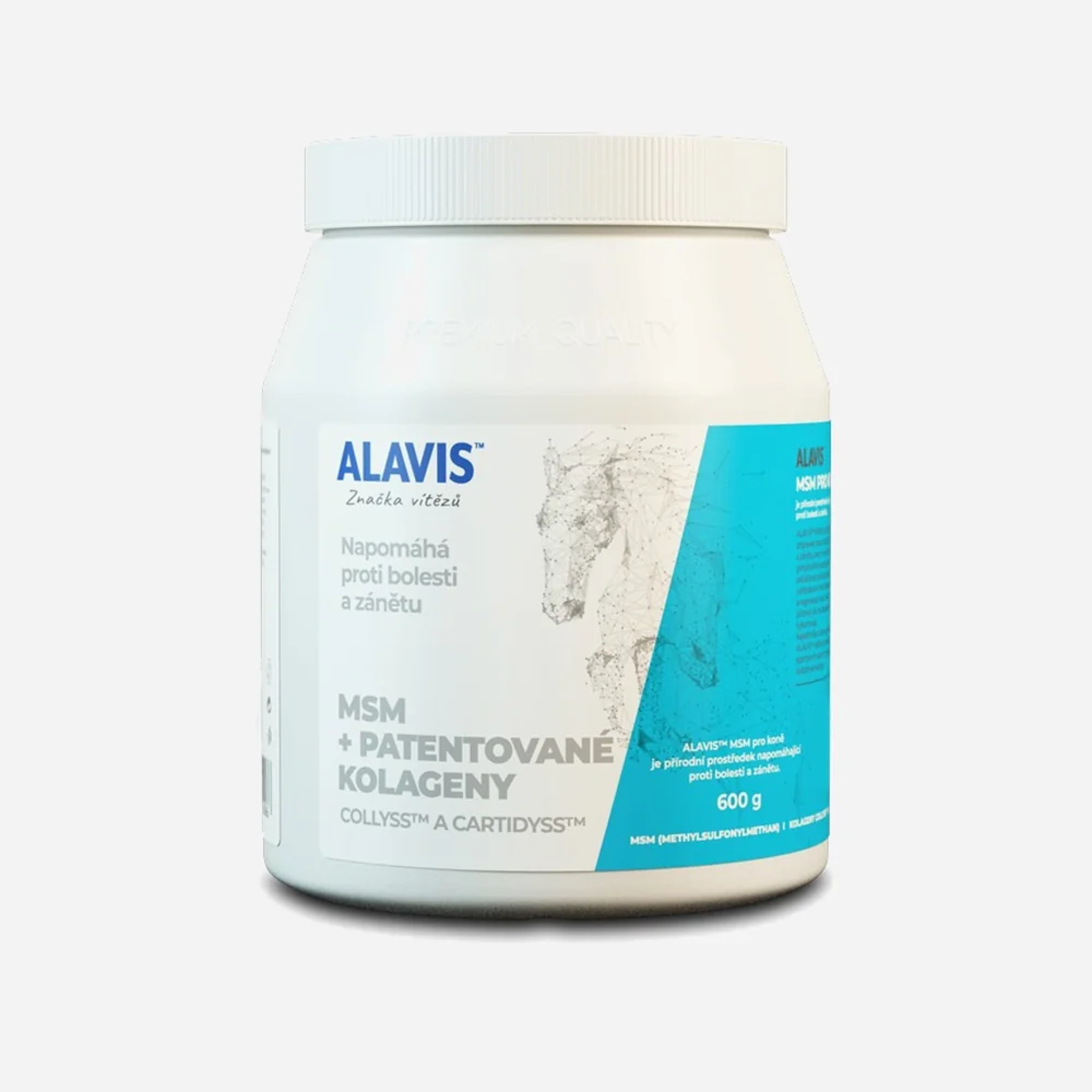 ALAVIS™ MSM pro koně má prokázané analgetické (bolest tišící) a antiflogistické (protizánětlivé) účinky. Snižuje produkci mediátorů zánětu, napomáhá zlepšení fyzické kondice, zpevňuje vazy a šlachy, chrání namáhané klouby a zlepšuje jejich funkci. Při užívání přípravku ALAVIS™ MSM bylo zjištěno lepší hojení ran, proto je vhodné ho užívat u poúrazových a pooperačních stavů.