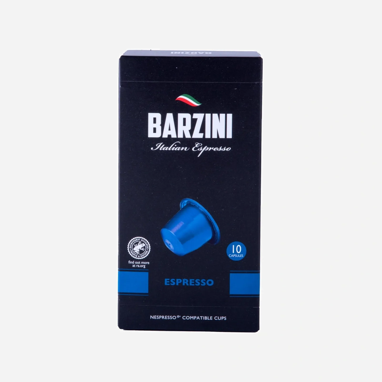Barzini Espresso – Italská vášeň v každé kapsli. Objevte plnou chuť pravého italského espressa s kapslemi Barzini, kompatibilními s kávovary Nespresso®. Bohaté aroma, sametová crema a intenzivní chuť – ideální pro každý den. Vyrobeno s vášní pro kvalitní kávu.