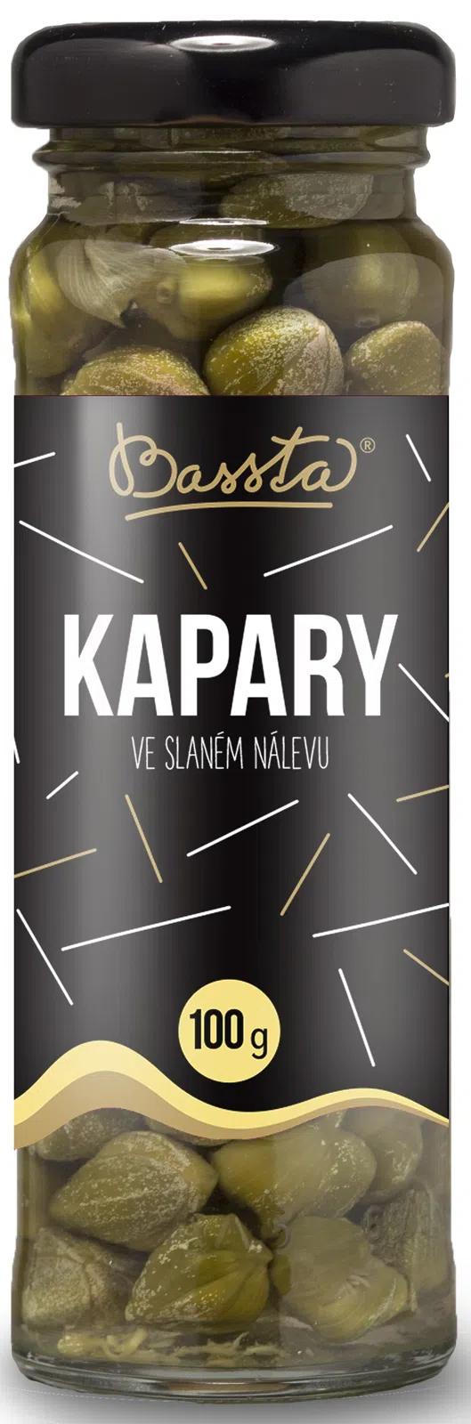 Kapary ve slaném nálevu Bassta jsou jemné poupata keře kapary trnité, naložená v solném roztoku pro zachování jejich výrazné chuti.