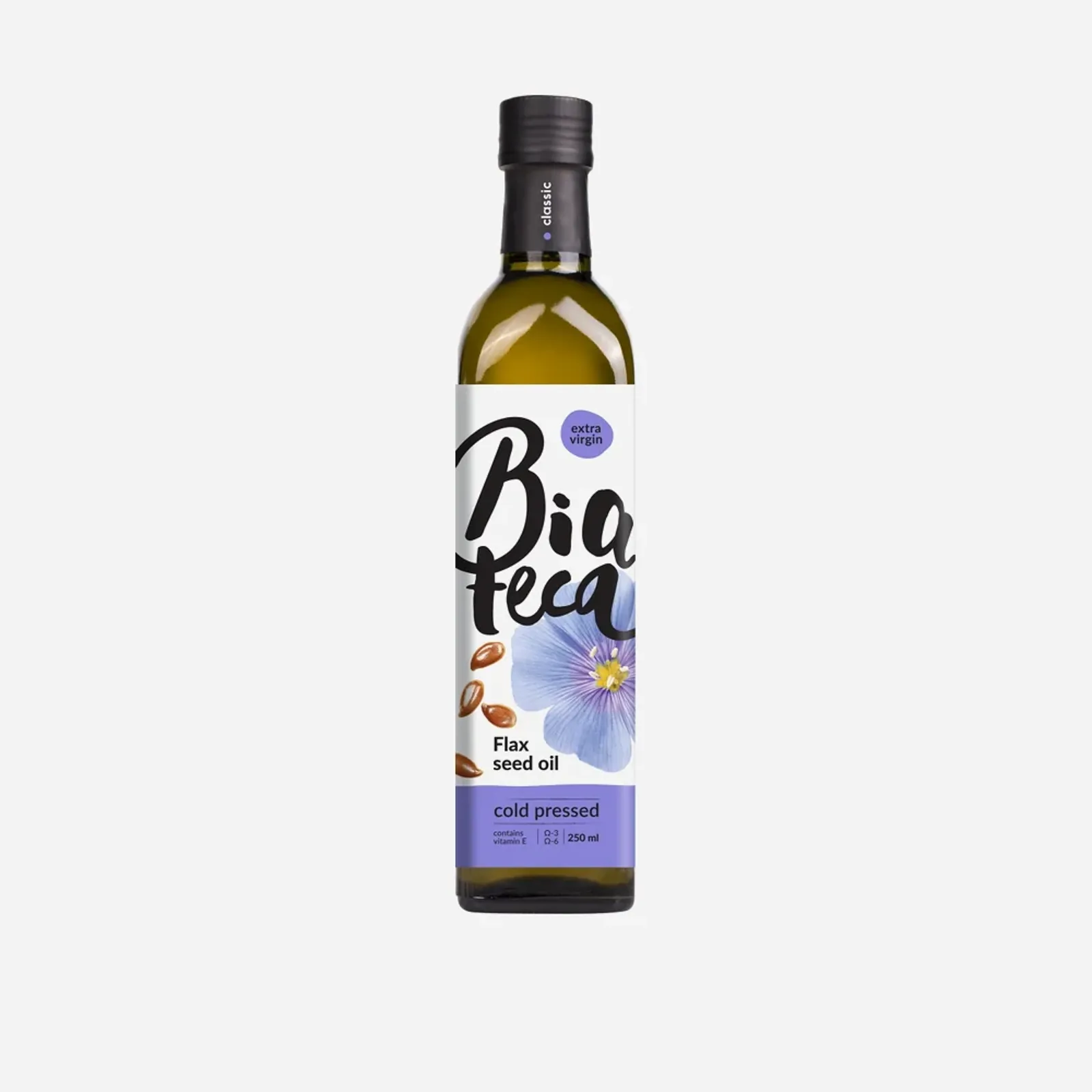Lněný olej, extra panenský, lisovaný za studena, nerafinovaný, 100% přírodní.