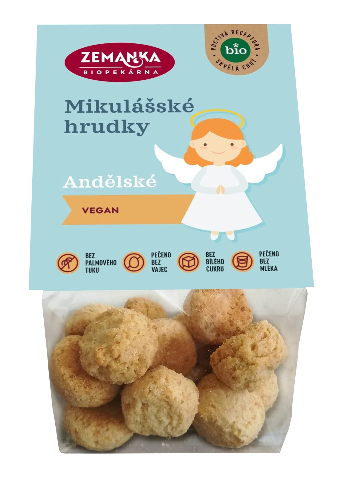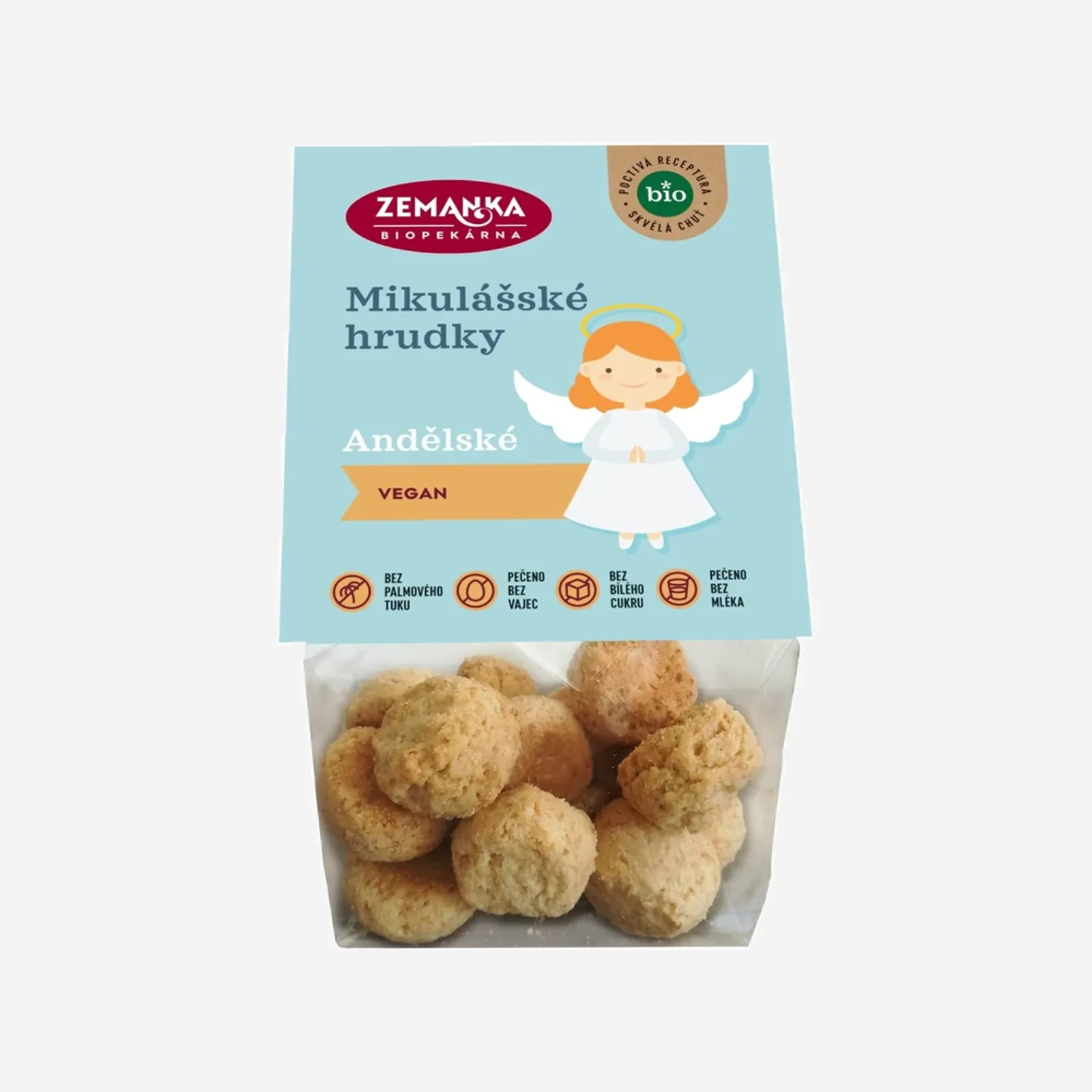 Mikulášské sušenky od anděla od Biopekárny Zemanka jsou jemné, křupavé sušenky s přirozenou chutí kokosu a nádechem vanilky, které potěší malé i velké mlsouny. Jsou vyrobeny výhradně z bio surovin, bez palmového tuku, bez bílého cukru a bez živočišných složek, a proto jsou vhodné i pro vegany.