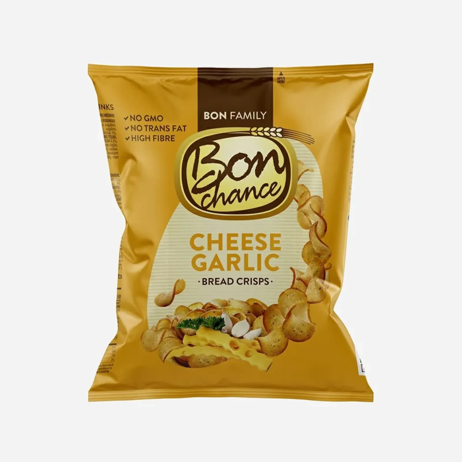 Luxusní Bon Chance křupavé chlebové chipsy připravené z pšenično - žitného chleba dochucené česnekem a sýrem. Vysoký obsah vlákniny.