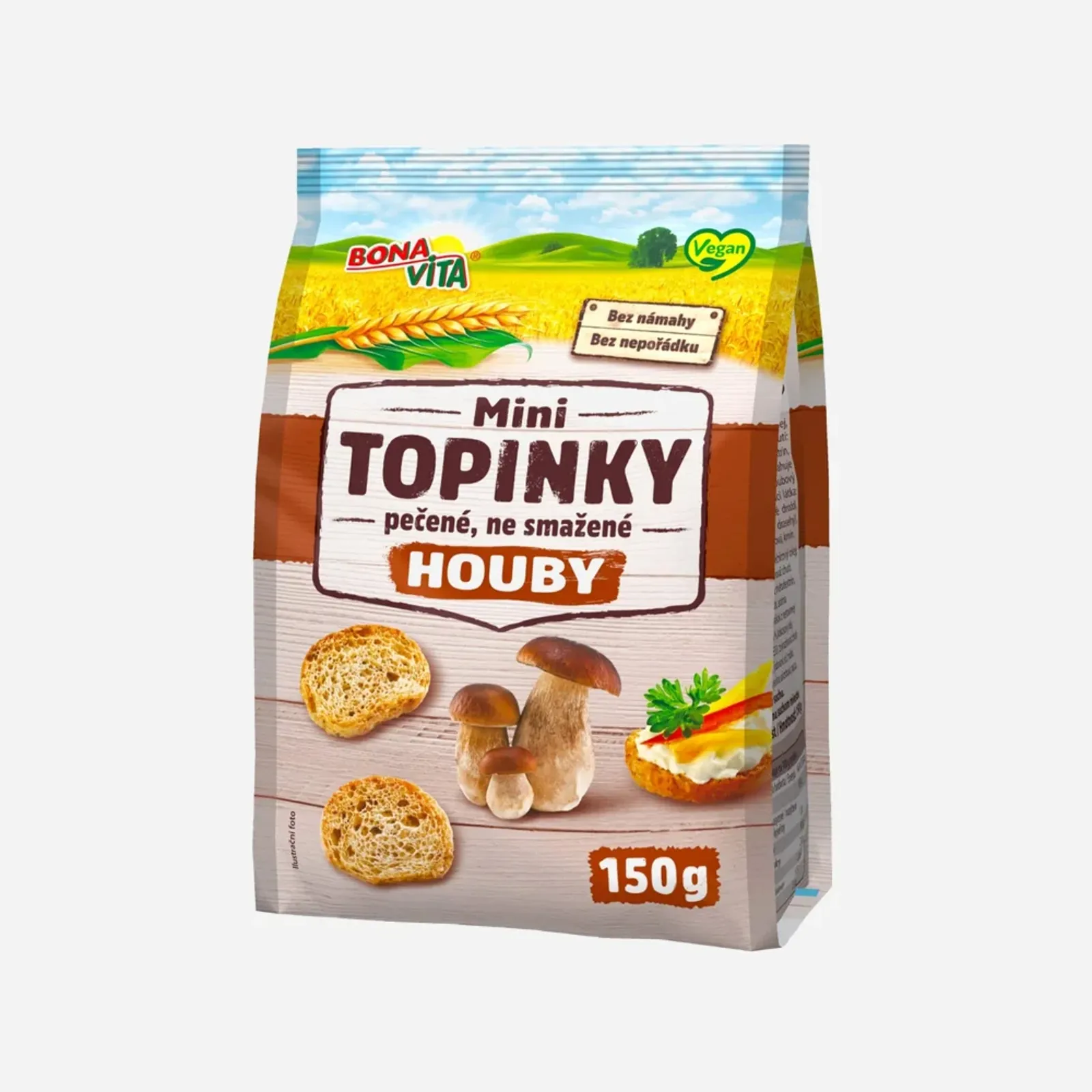 Složení: pšeničná mouka, slunečnicový olej, houbová příchuť 3,1 %, [jedlá sůl, zvýrazňovač chuti: E 621, dextróza, kukuřičný škrob, maltodextrin, sójový bílkovinný hydrolyzát, aroma (obsahuje sóju a mléko), prášek z restované cibule, houbový prášek 0,8 %, kokosový olej, protihrudkující látka: E551, zvýrazňovač chuti: E635], pekařské droždí, cukr, jedlá sůl s jódem (jedlá sůl, jodid draselný), mouku upravující látka: kyselina askorbová, kmín