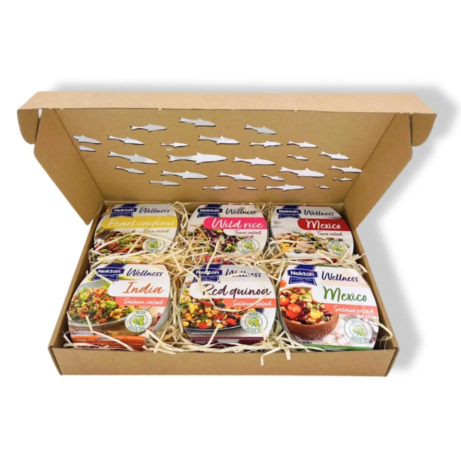 Balíček obsahuje Tuňákový salát Wellness Pearl Couscous 160 g, Tuňákový salát Wellness Mexico 160 g, Tuňákový salát Wellness Wild rice 160 g, Lososový salát Wellness India 160 g, Lososový salát Wellnes Mexico 160 g, Lososový salát Wellnes Red Quinoa 160 g.