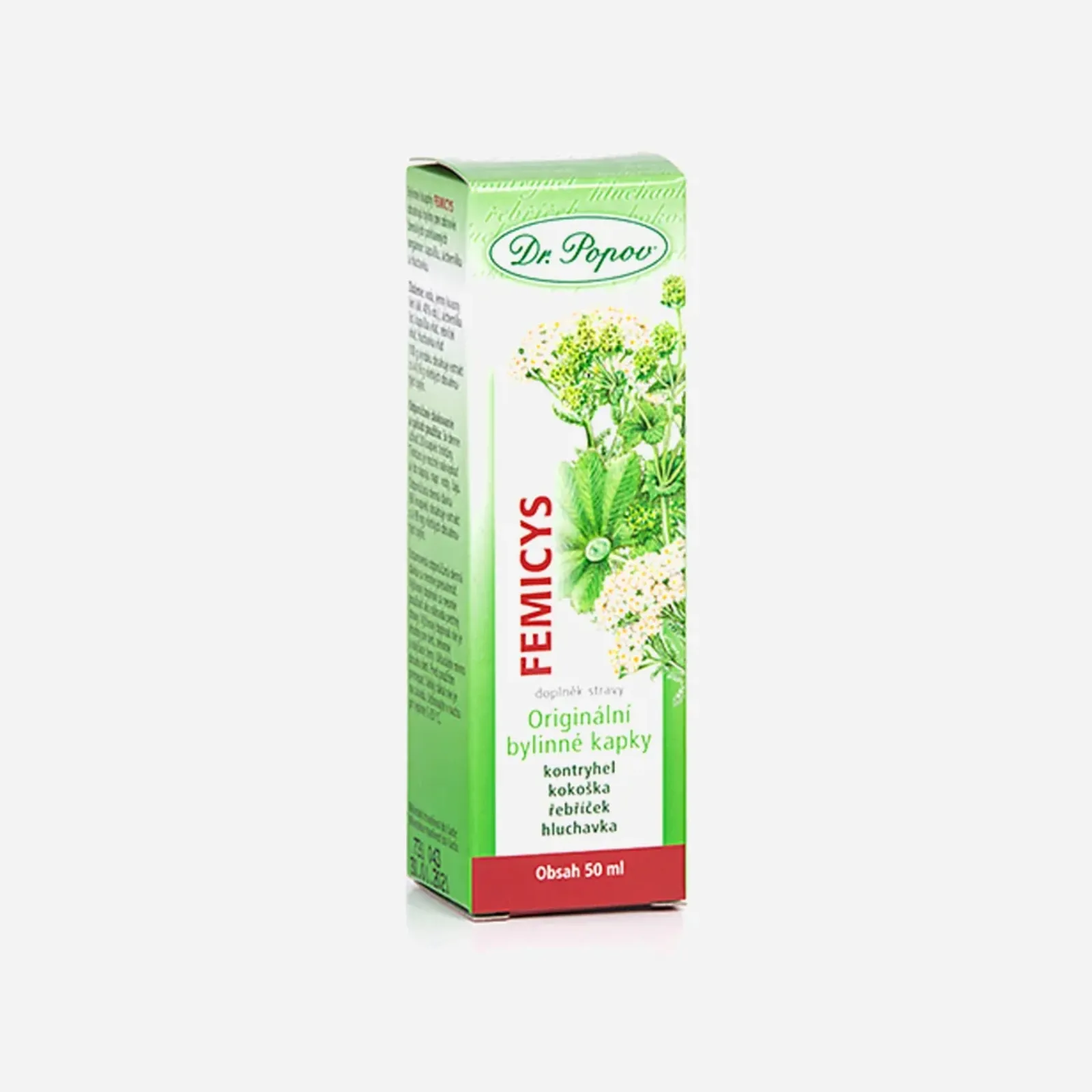 Bylinné kapky Femicys Dr. Popova obsahují byliny pro zdraví ženských pohlavních orgánů: kontryhel list, kokoška nať, řebříček nať, hluchavka nať.