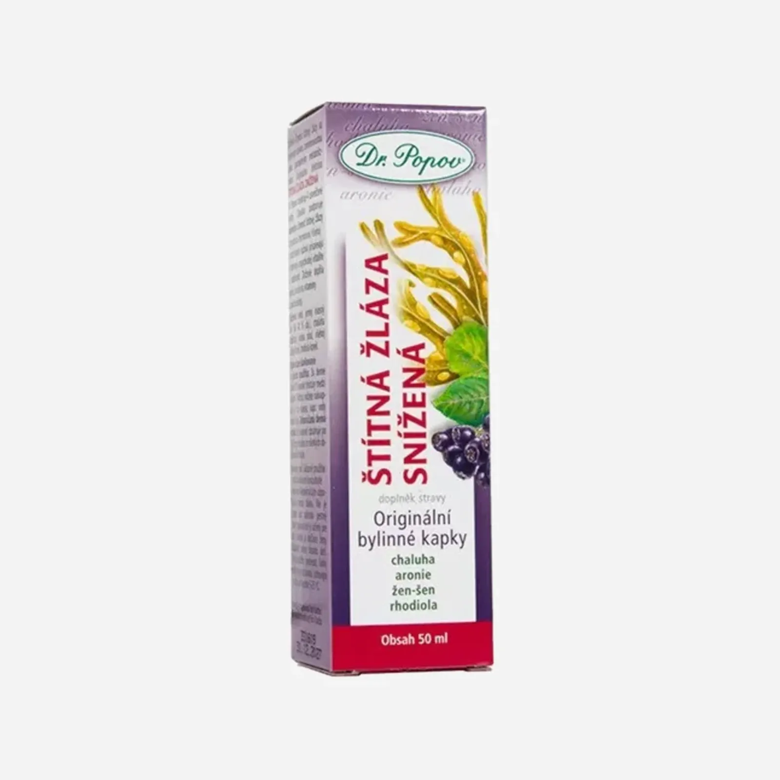 Snížená činnost štítné žlázy se projevuje únavou, zimomřivostí nebo zpomaleným metabolismem. Originální bylinná tinktura Dr. Popova Štítná žláza snížená obsahuje 4 osvědčené byliny. Chaluha podporuje normální činnost štítné žlázy a produkci hormonů. Žen-šen a rhodiola přispívají k tělesné a psychické vitalitě a odolnosti. Složení vhodně doplňuje aronie, bohatá na vitamíny a antioxidanty.