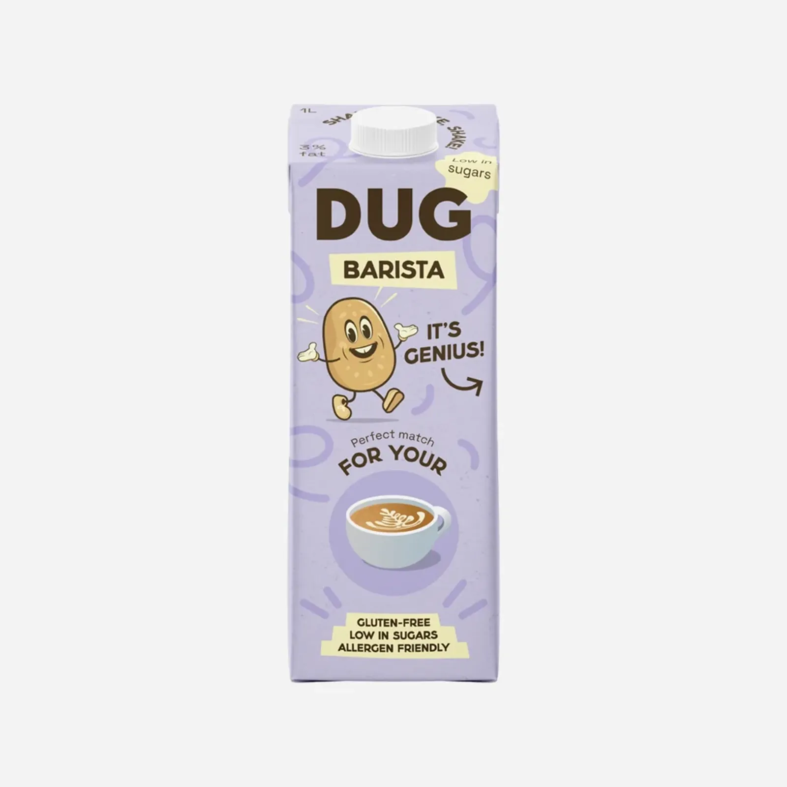 Zahřejte a ušlehejte do pěny v baristické kvalitě nebo ji rovnou nalijte do šálku kávy či čaje. Ať tak či onak, DUG Barista chutná úžasně. DUG Barista vyrobený z brambor je nabitý vitamíny, minerály, vlákninou a bílkovinami.