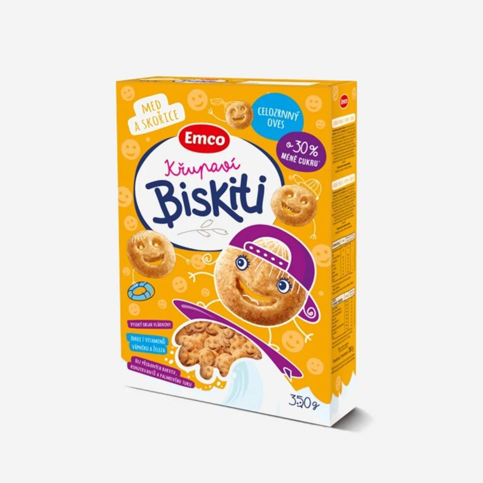 Křupaví Biskiti jsou extrudované dětské cereálie ve tvaru hravých smajlíků, jejichž základem je celozrnný oves. Mají o 30 % méně cukru v porovnání s řadou výrobků této kategorie. Obsahují vitamin D a vitaminy skupiny B, minerální látky vápník a železo, které jsou nezbytné pro zdravé zuby a kosti.