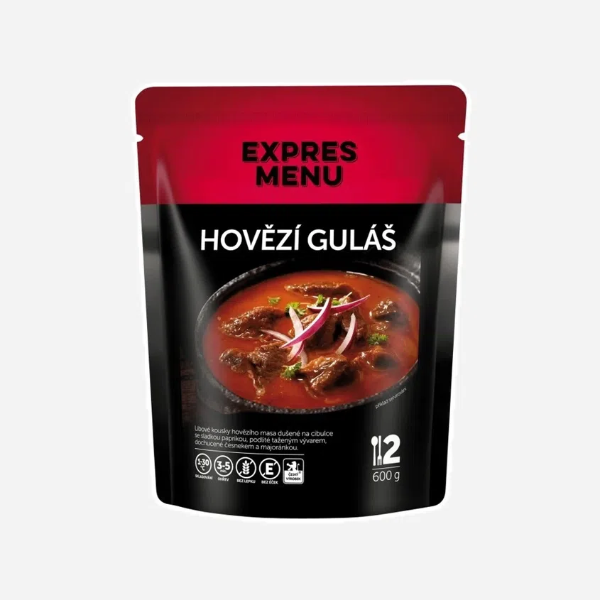 Složení: Hovězí maso přední (31 %), hovězí vývar (voda, hovězí maso a kosti), cibule, rýžová mouka, česnek, kukuřičná mouka, řepkový olej, rajčatový protlak (voda, rajčatový protlak, sůl), paprika mletá, sůl kamenná, majoránka, kmín, pepř.