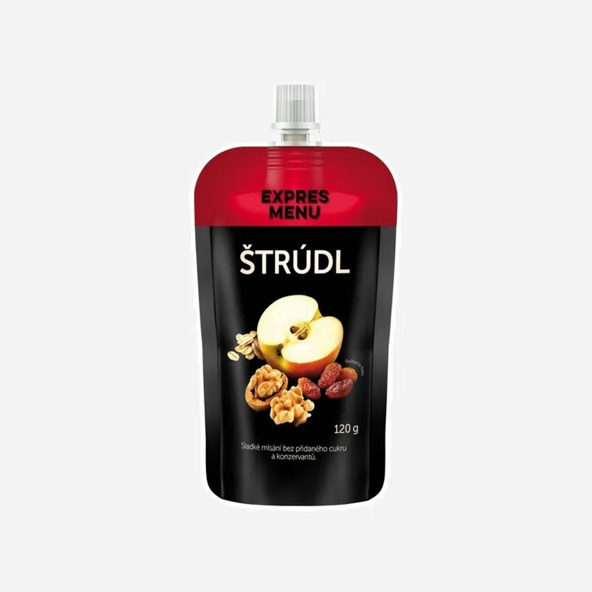 Sterilovaná homogenizovaná pasta z jablek, ovesných vloček a vlašských ořechů k přímé konzumaci.