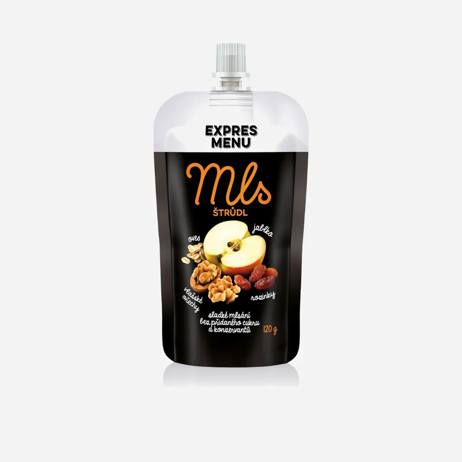 Složení: Jablka 35 %, voda, ovesné vločky 10 %, vlašské ořechy 7 %, rozinky 5 % (rozinky, slunečnicový olej), skořice, sůl.