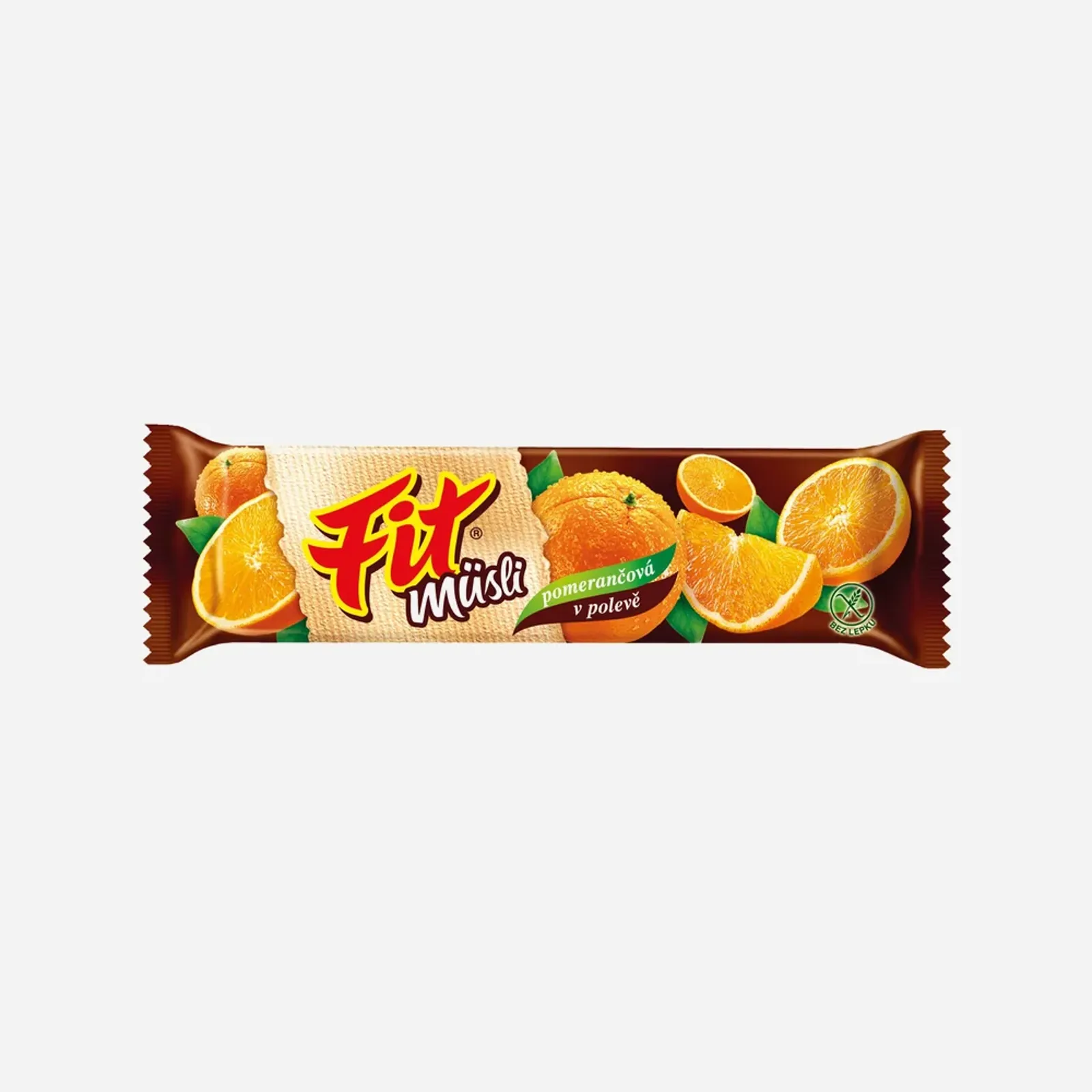 Müsli tyčinka FIT GO je cereální tyčinka s příchutí pomeranče, která je částečně politá čokoládovou polevou.