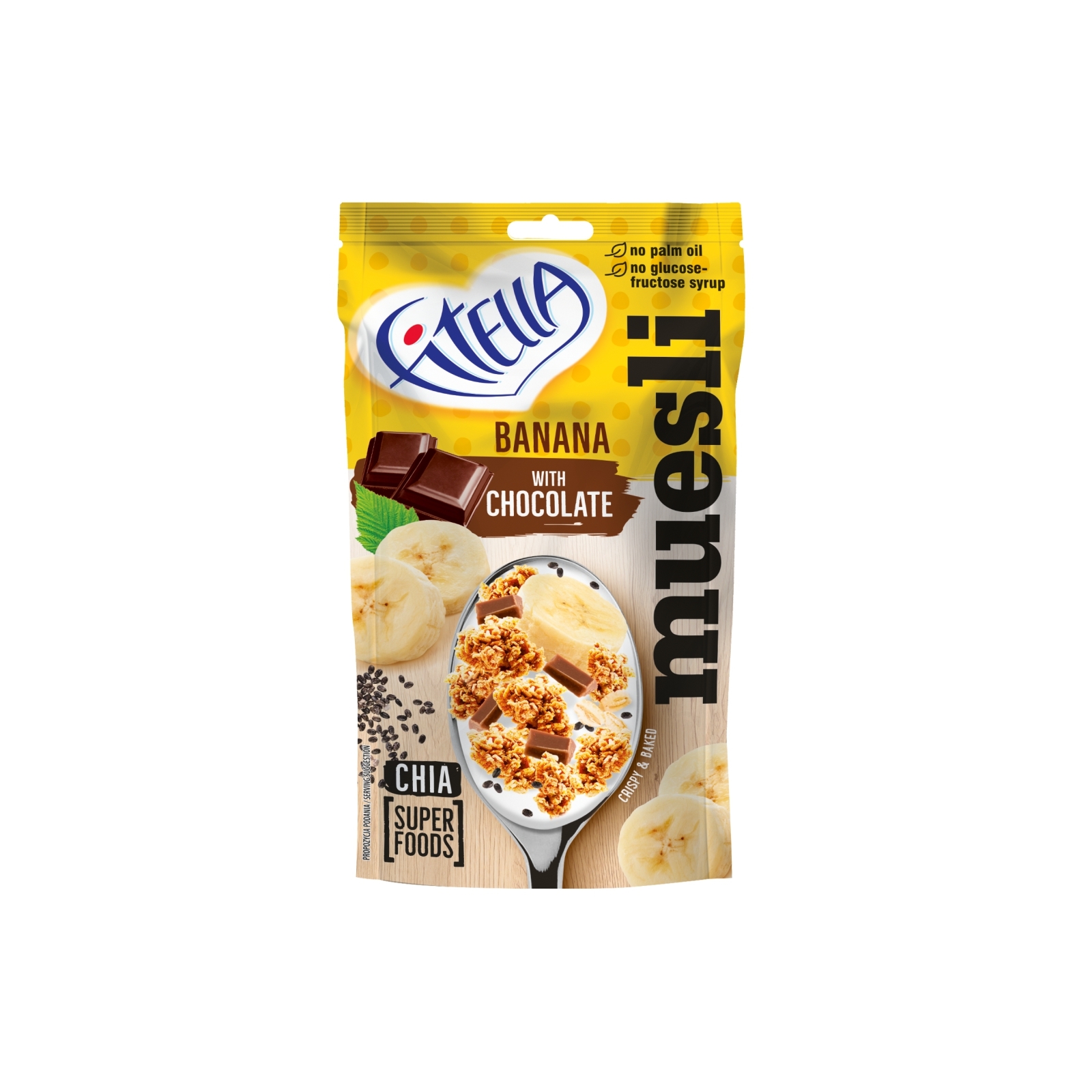 Banánové muesli s čokoládou a chia semínky. Bez palmového oleje, bez glukózového sirupu, přirozený zdroj vlákniny. Obsahuje superfoods a přírodní ingredience.