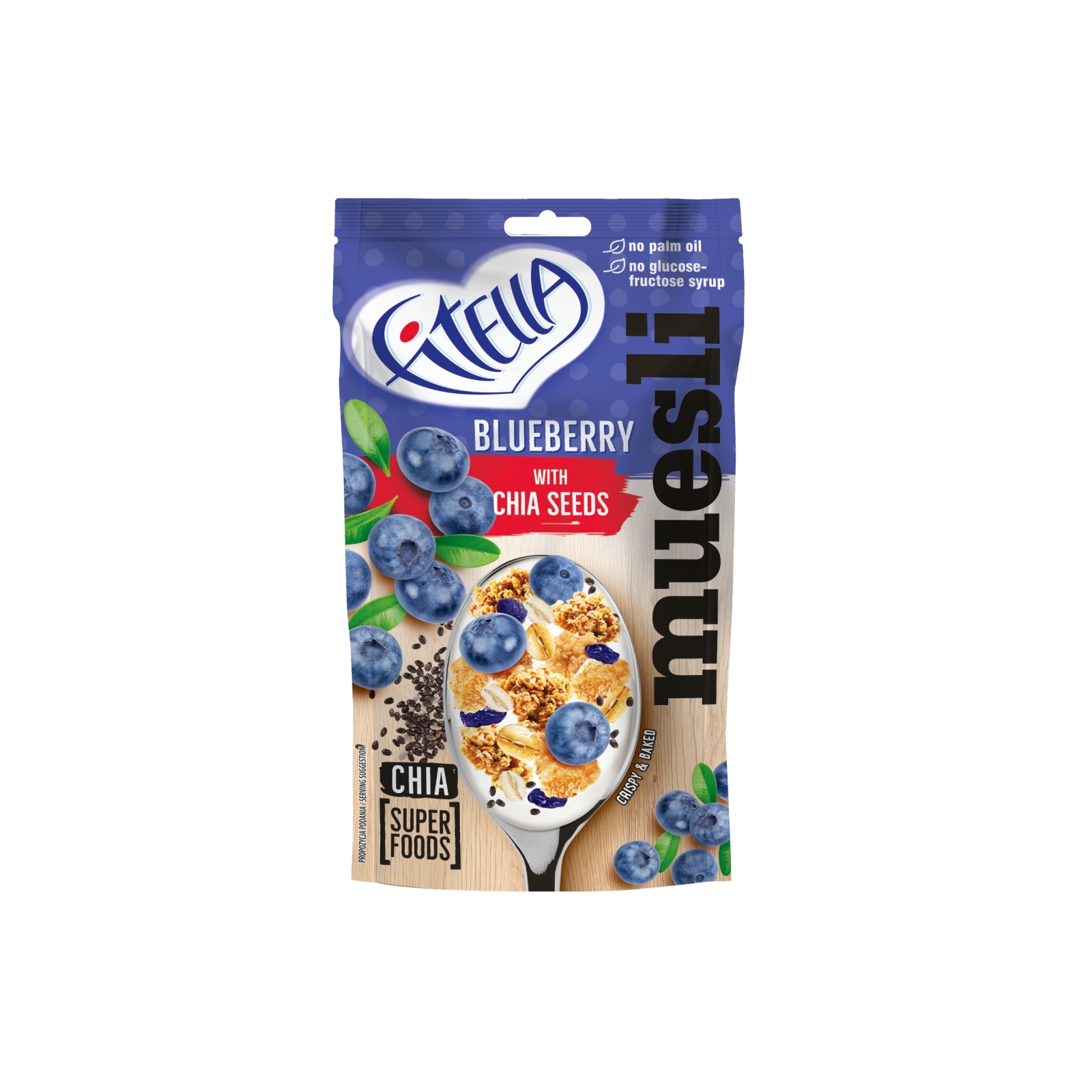 Muesli Fitella s borůvkami a chia semínky. Bez palmového oleje, bez glukózového sirupu, přirozený zdroj vlákniny. Obsahuje superfoods a přírodní ingredience.