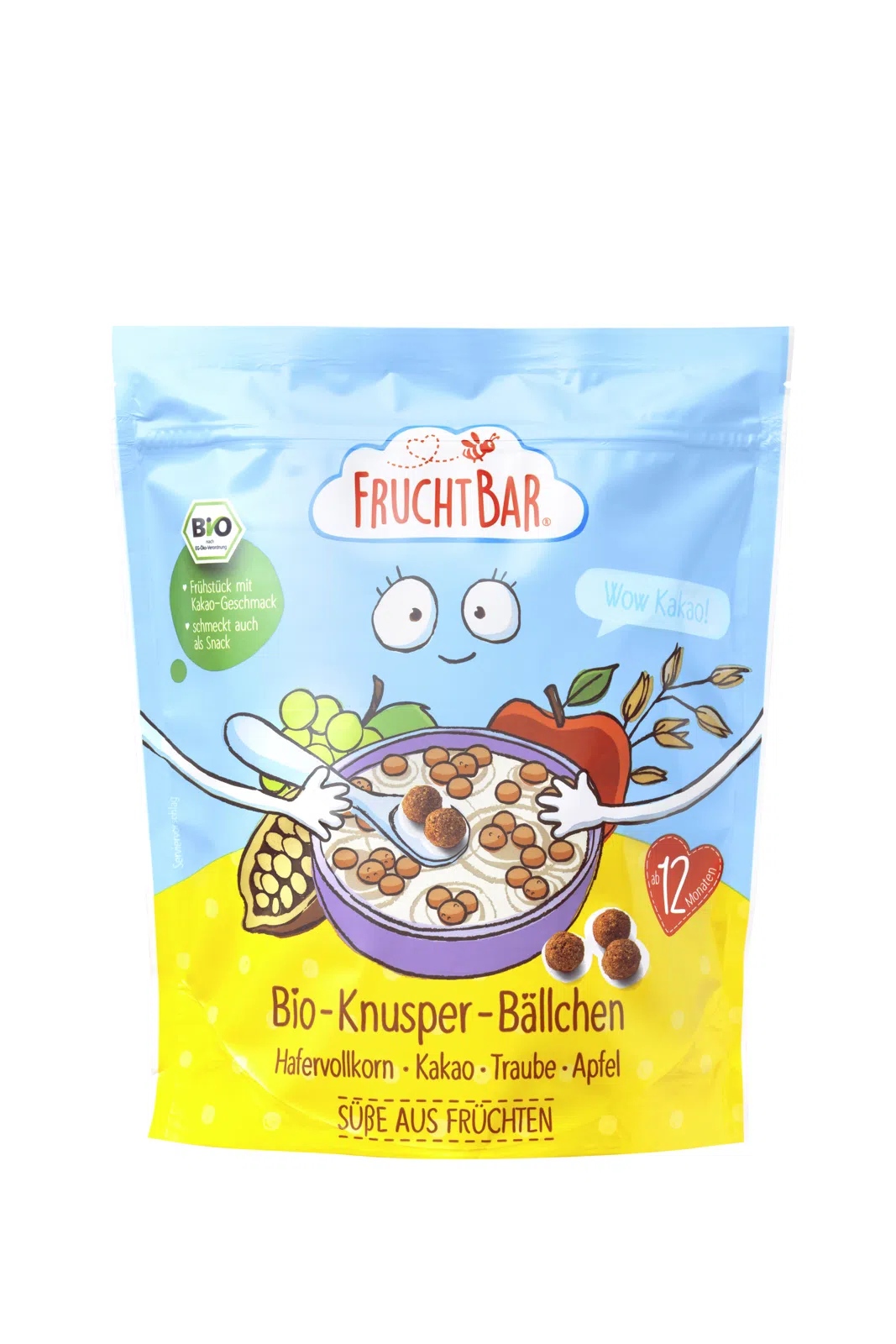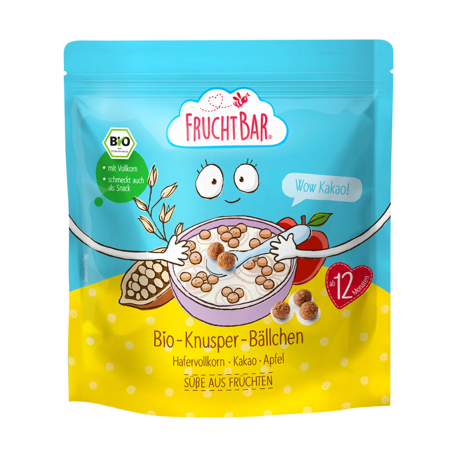 Od kdy můžete dát dětem cereálie? Kakaové kuličky od FruchtBar jsou určené pro děti již od ukončeného 12. měsíce. Nepřidává se žádný cukr, přesto chutnají příjemně sladce díky hroznové a jablečné šťávě. Doplňte mlékem či jogurtem a čerstvým ovocem a máte během chvilky zdravou snídani či svačinu. Výrobek z certifikovaného ekologického zemědělství.