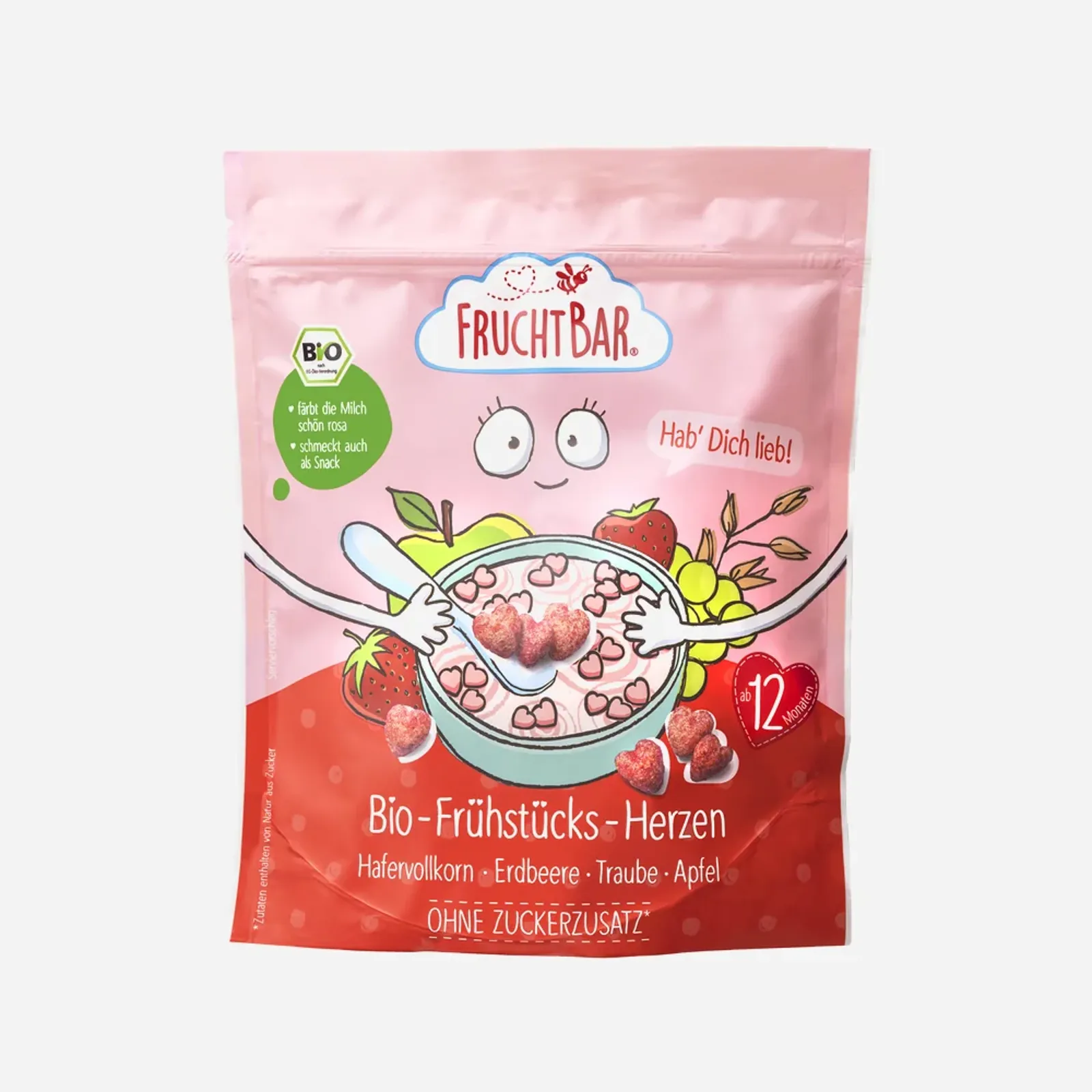 Od kdy můžete dát dětem cereálie? FruchtBar srdíčka s jahodami a jablkem jsou určené pro děti již od ukončeného 12. měsíce. Nepřidává se žádný cukr, přesto chutnají příjemně sladce díky jablečné šťávě. Doplňte mlékem či jogurtem a čerstvým ovocem a máte během chvilky zdravou snídani či svačinu. Výrobek z certifikovaného ekologického zemědělství.