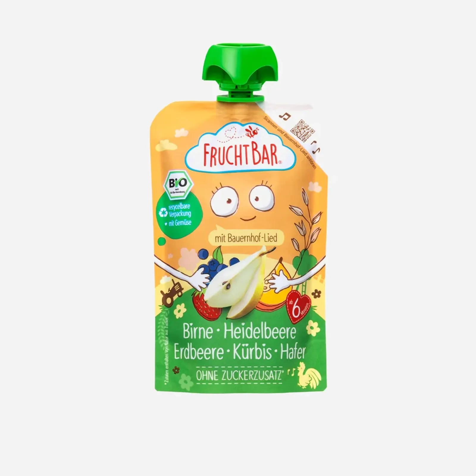 Ovocná svačinka, která díky ovesným vločkám lépe zasytí všechny malé objevitele. BIO ovocná kapsička FruchtBar obsahuje pyré z hrušek, jahod, banánů, borůvek, dýně a ovesné vločky. Nepřidává se cukr ani umělá aromata či konzervanty. Je vhodná pro děti od ukončeného 6. měsíce. Výrobek z certifikovaného ekologického zemědělství.