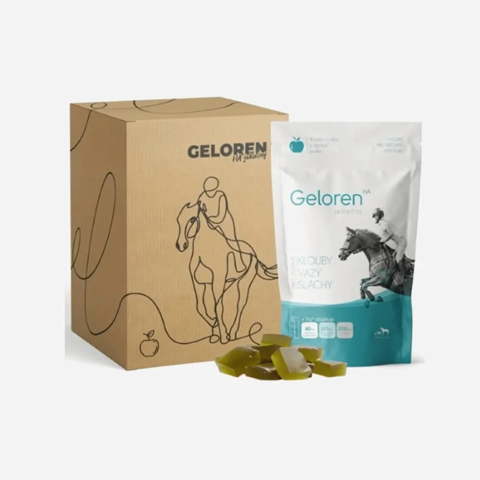 Jablečný Geloren HA je nová příchuť známé a prověřené želatinové kloubní výživy pro koně. Obsahuje stejné množství aktivních látek jako višňový. Navíc obsahuje mořskou řasu chlorellu. Díky své spolehlivosti je oblíbený nejen u sportovních koní. Geloren HA je doporučován u většiny typů kloubních problémů, napomáhá při řešení kloubních onemocnění, preventivně chrání kloubní aparát a prodlužuje aktivní život. Geloren HA je vhodné užívat při akutních pohybových problémech, při nadměrné zátěži, pro aktivní pohyb i ve stáří.