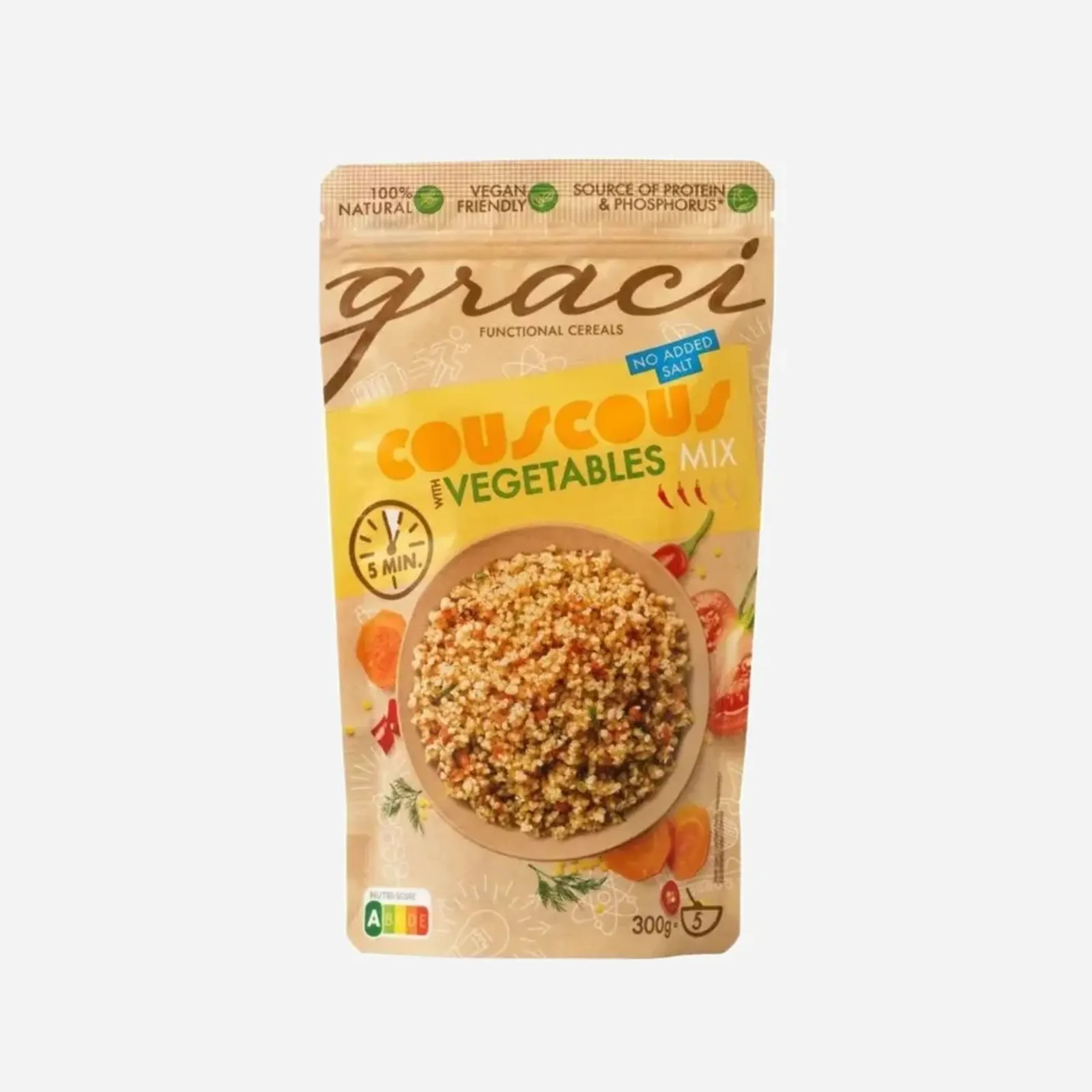 Plnohodnotná příloha k jídlu hotová za 5 minut. Graci funkční kuskus se zeleninou je výborně ochucená směs se 100% přírodním složením a rychlou přípravou.