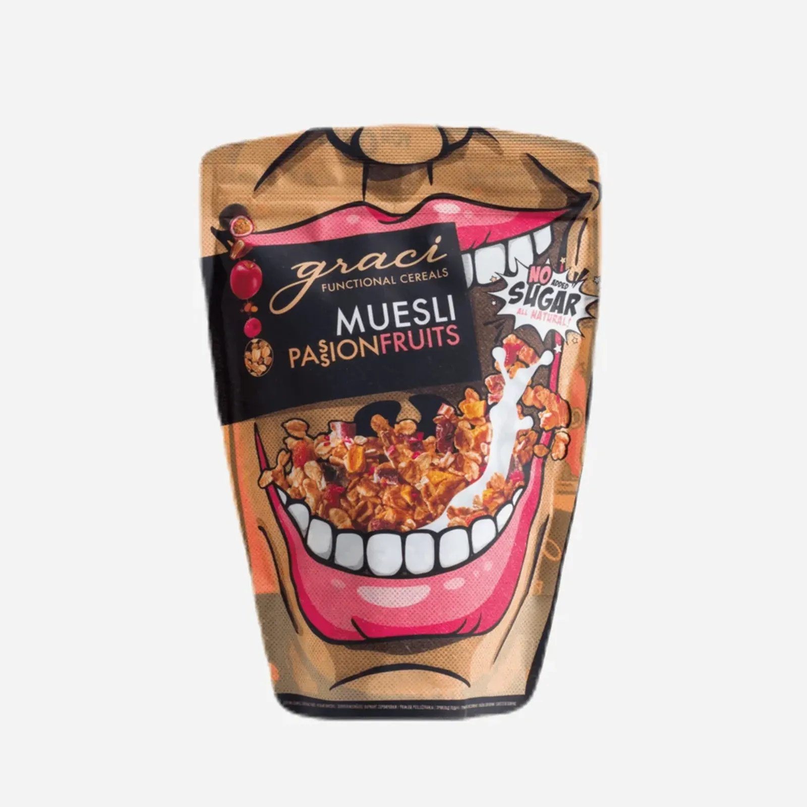 Složení: Opékané celozrnné pšeničné vločky (původ EU) 60 %, směs ovoce a bobulí 27,8 % (sušené datlové kousky 14,5 % (datle, rýžová mouka), rozinky 11 %, mrazem sušené smoothie kousky 1 % (banánové pyré, mangové pyré koncentrát, koncentrát šťávy z marakuji), sušené kousky jablek 1 %, lyofilizované kousky malin 0,3 %), celozrnné ovesné vločky.