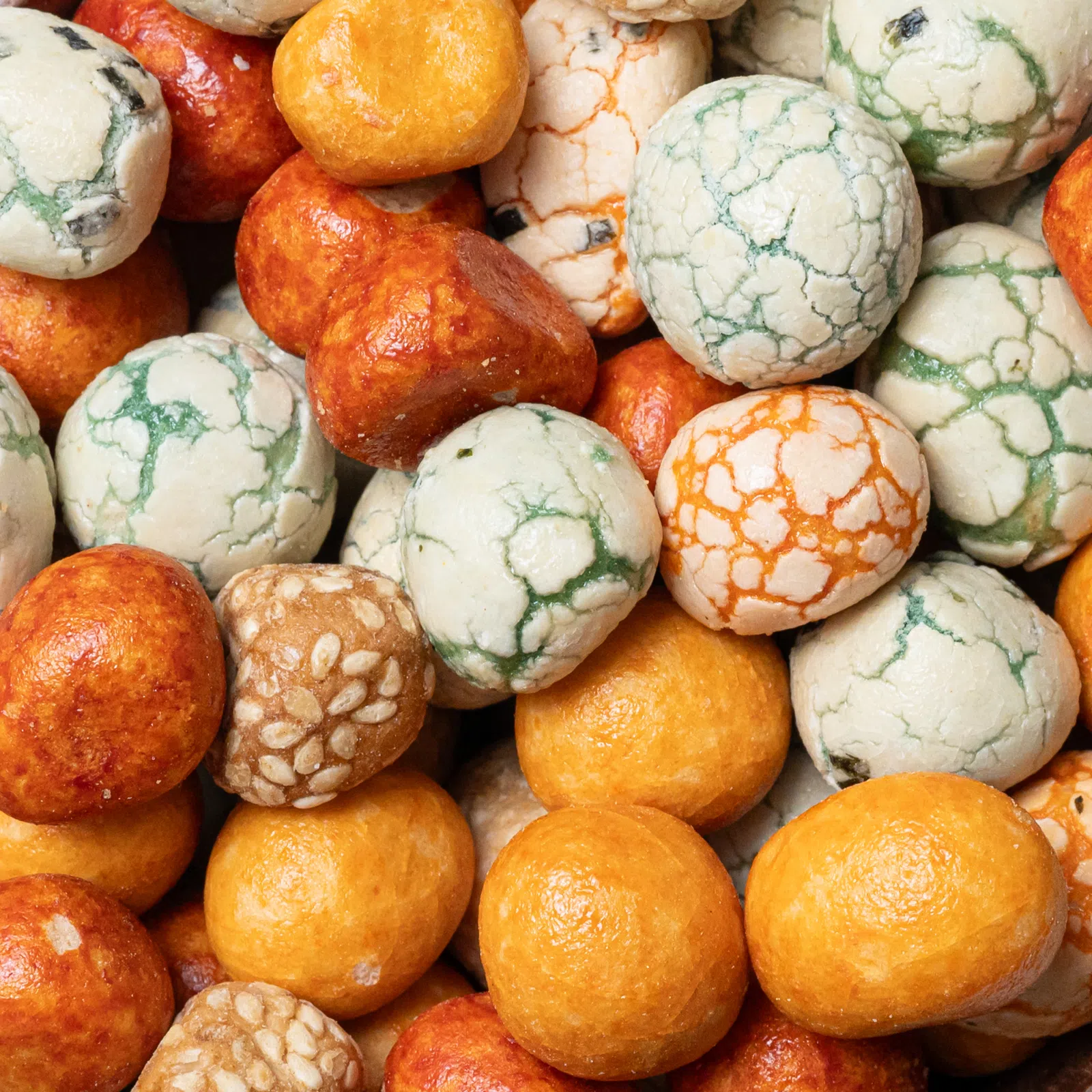 | Složení: | přeničná mouka, arašídy 25 %, cukr, modifikovaný kukuřičný škrob, sezamové semínko, maltodextrin, sójová omáčka (voda, sója, pšenice, sůl), mořská sůl, barviva: E150a; E160c; E100; E141, mořské řasy. |