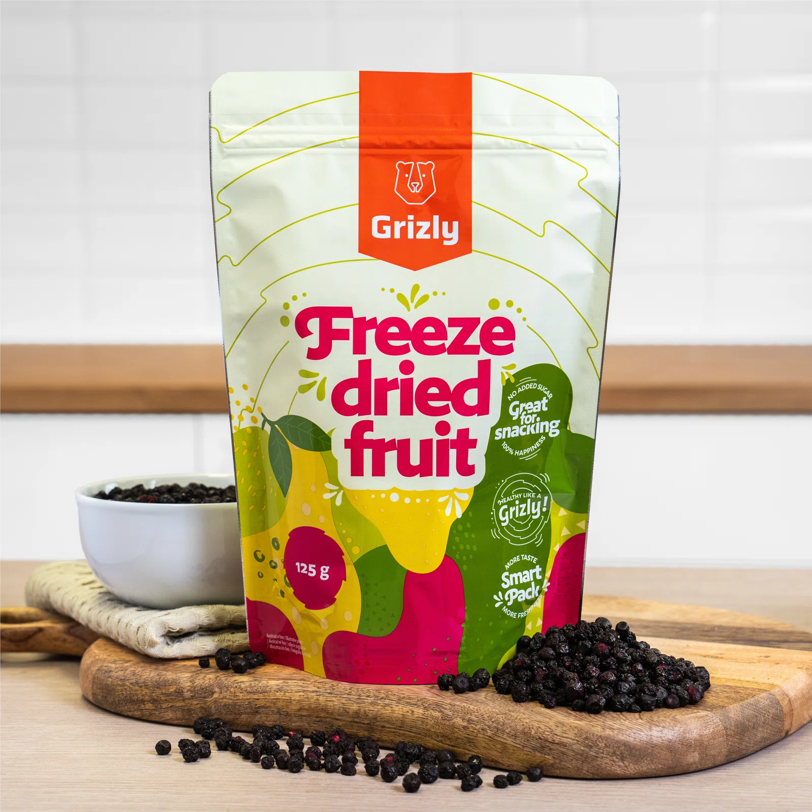 Mrazem sušené borůvky GRIZLY jsou doslova vitamínovou bombou. Lyofilizací a díky znovuuzavíratelnému obalu vydrží stále čerstvé.