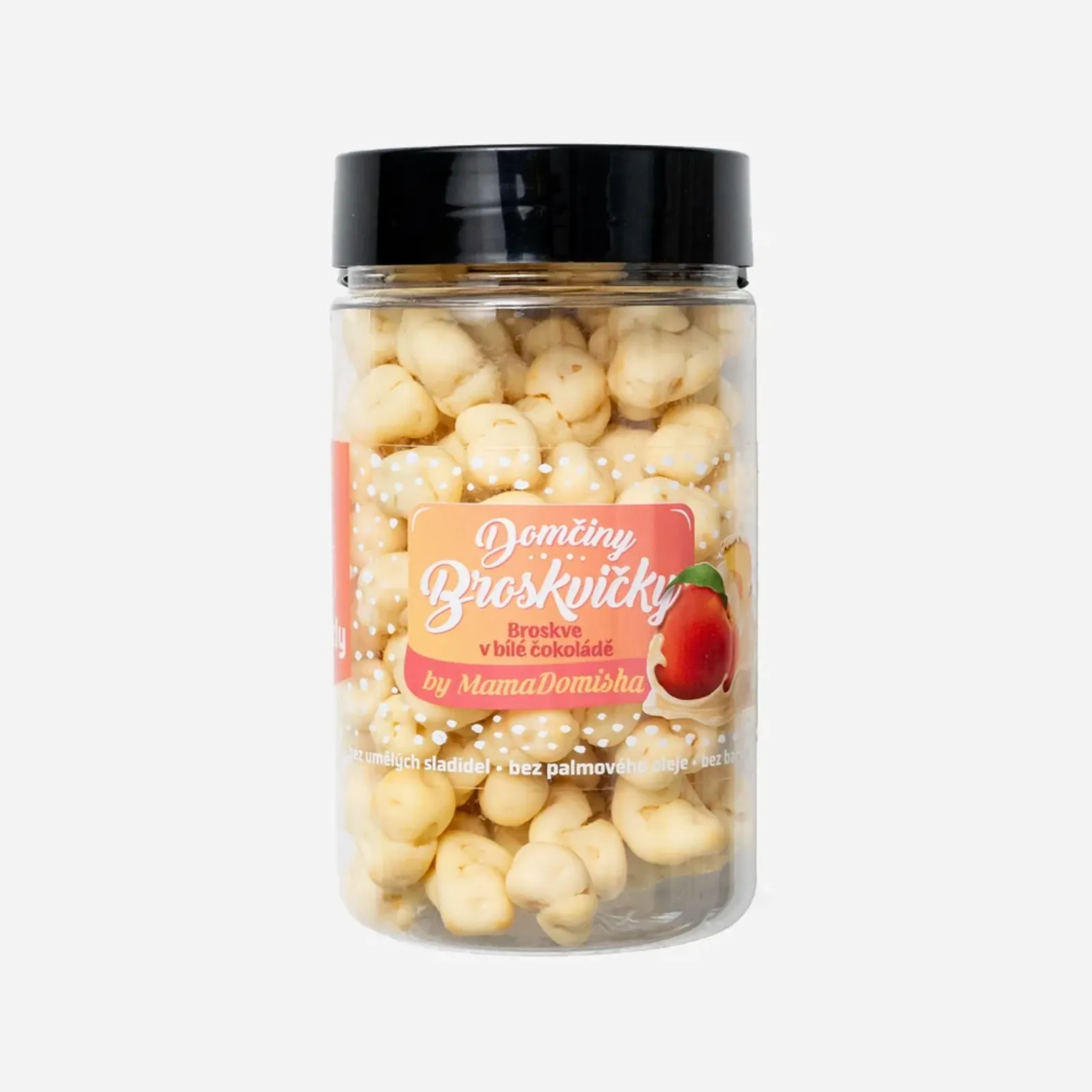 Tak sladké, tak neodolatelné... stačí jen dózu jen otevřít a vložit do pusy! Domčiny broskvičky prostě musíte ochutnat, ať se děje, co se děje. A věřte nám, je to fakt zážitek zakousnout se do sladkého ovoce, které jsme nechali obalit do lahodné bílé čokolády. Ano, je to tak, Domčiny broskvičky jsou ve skutečnosti lyofilizované (tedy mrazem sušené) broskve v bílé čokoládě. Nejlepší jsou jen na tak na chuť, s přehledem však zvládnout vylepšit svačinový oříškový mix nebo ranní kaši – fantazii se meze nekladou. Jedno je ale jisté, tohle broskvové potěšení je prostě trefou do černého, vlastně spíš bílého!
