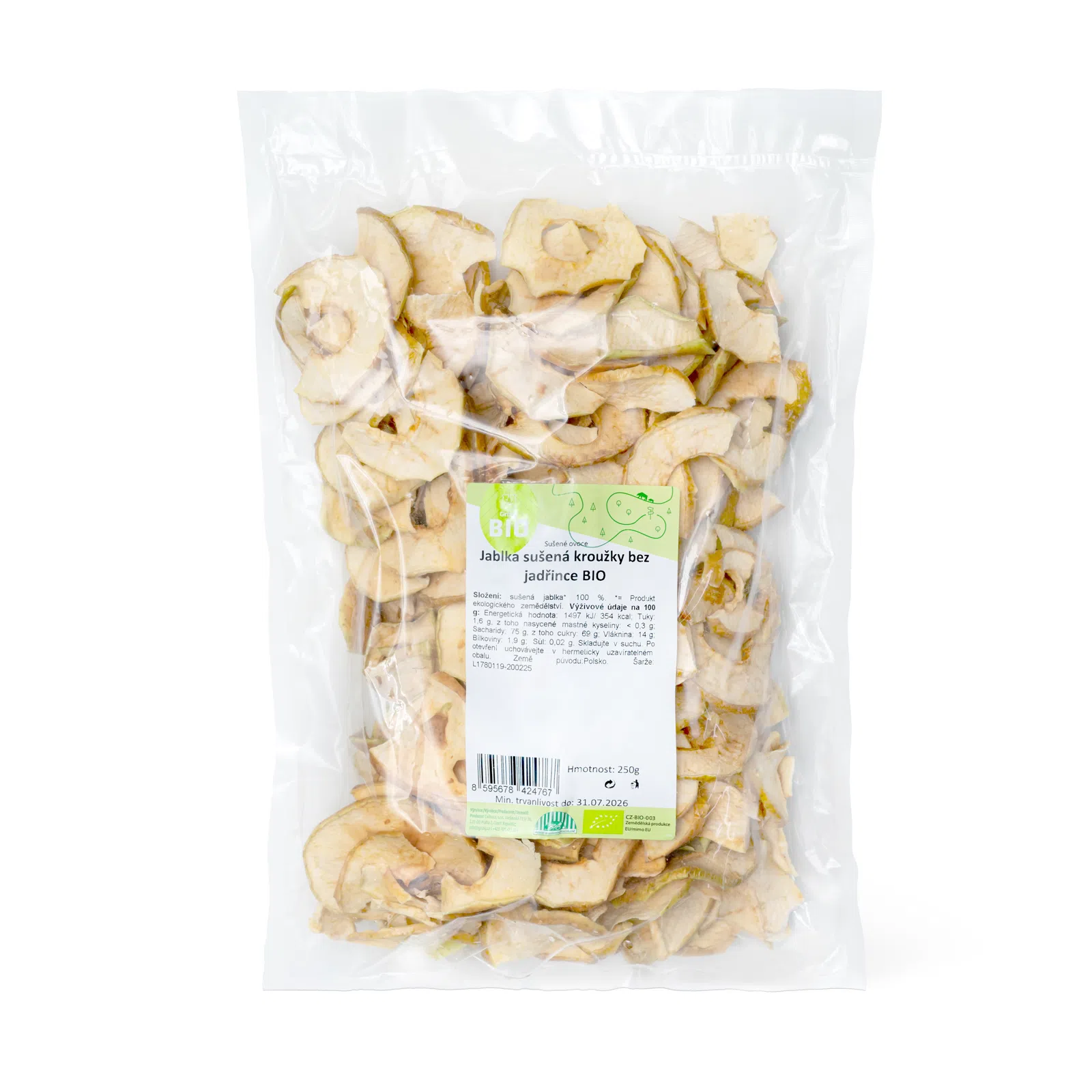 Objevte lahodnou chuť sušených jablečných kroužků v BIO kvalitě! Naše sušená jablka jsou vyrobena z pečlivě vybraných, plně zralých plodů z ekologického zemědělství. Jsou jemně sušené horkým vzduchem, čímž si zachovávají svou přirozenou sladkost, příjemnou vůni a měkkou konzistenci. Neobsahují žádný přidaný cukr ani jiné látky – jen čistou chuť jablek. BIO sušená jablka jsou skvělou volbou pro zdravé mlsání i praktickou svačinku na cesty. Přidejte je do domácí granoly, müsli, ovesné kaše nebo vlastního oříškovo-ovocného mixu. Skvěle se hodí také k pečení a přípravě dezertů.